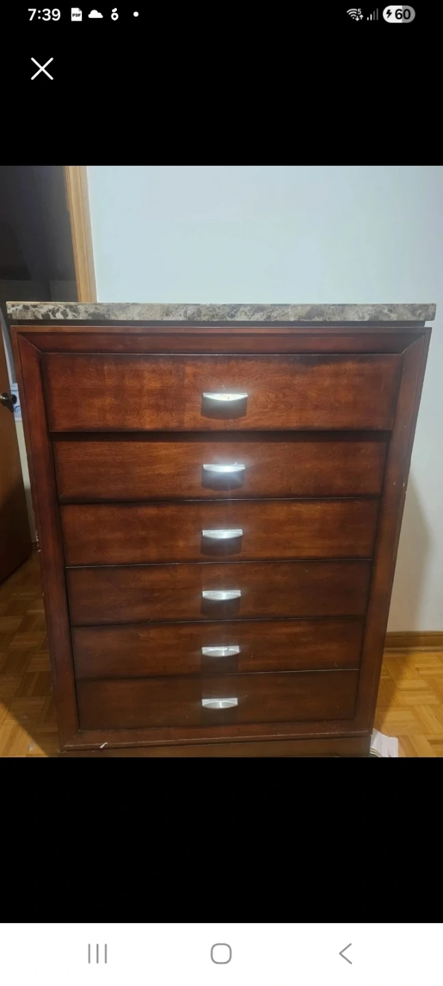 Dark brown 5-drawer dresser with silver handles. Features a marble-look top. Offers ample storage space for clothing or linens. Its classic design fits well in most bedroom decors.