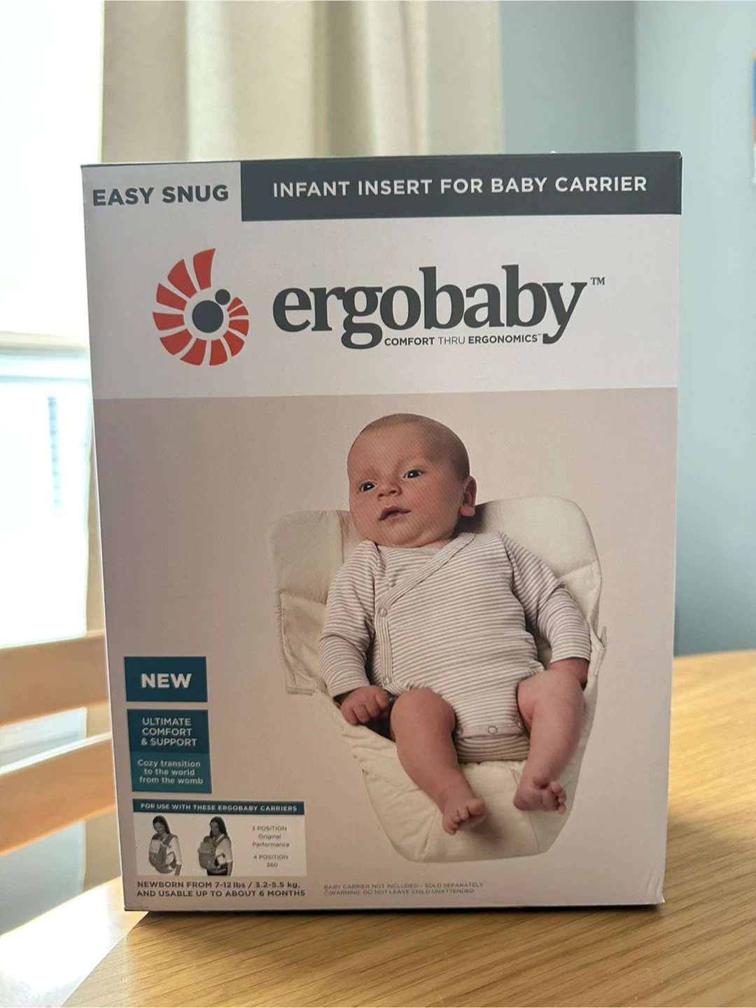 Selling a like-new Ergobaby Easy Snug Infant Insert! It's designed for a cozy transition from the womb and provides ultimate support and comfort for your little one. Perfect for use with Ergobaby carriers!