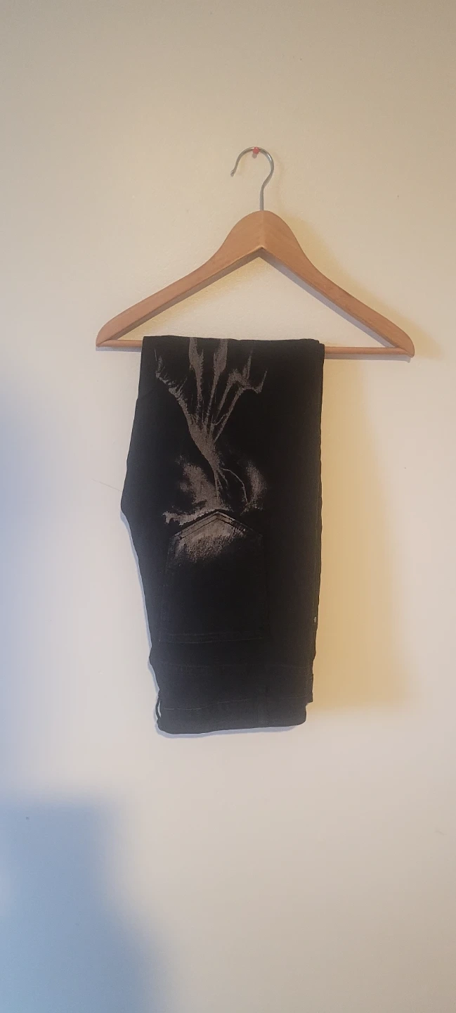 Black jeans featuring a unique abstract graphic print on the front. Denim material. They're a great statement piece for any wardrobe!