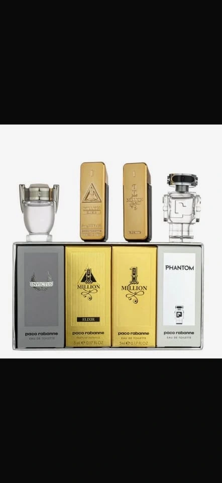 This set includes 1 Million Eau de Toilette, 1 Million Elixir Parfum Intense, Invictus Eau de Toilette, and Phantom Eau de Toilette. All are 0.17 oz mini sizes.