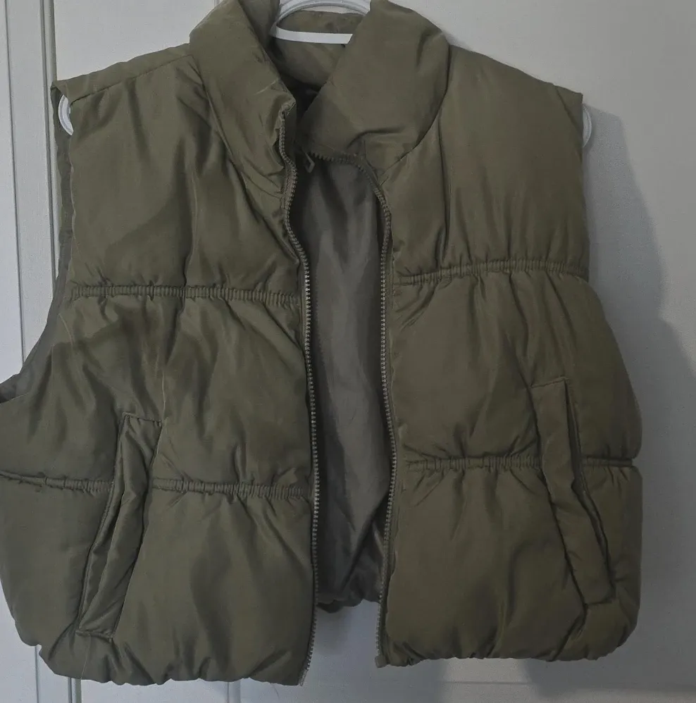 Olive green puffer vest with a zip-up front. It has a stand-up collar and two side pockets. Padded for warmth.