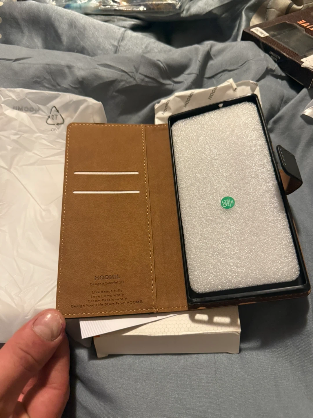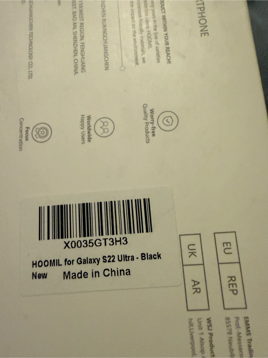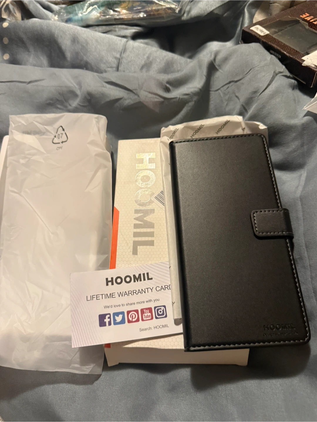 This is a black HOOMIL case for the Samsung Galaxy S22 Ultra. It's made of leather with card slots. Includes original packaging and lifetime warranty card.