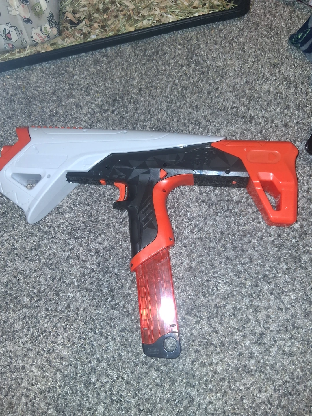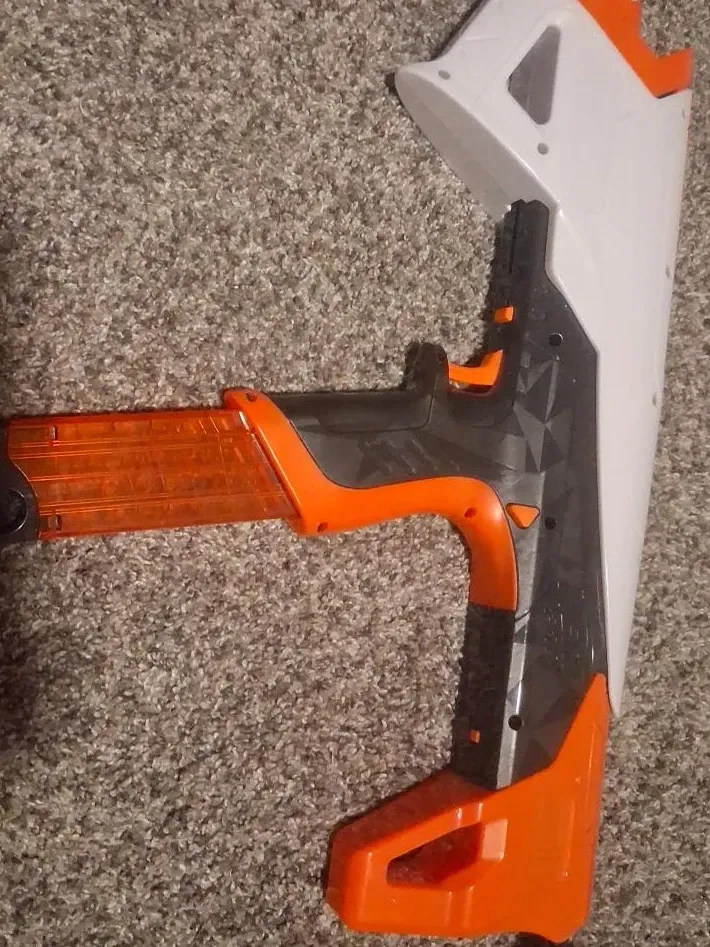 This is a Nerf Pro GS-10 blaster. It comes with the detachable stock and a removable magazine. Ready for some outdoor fun!