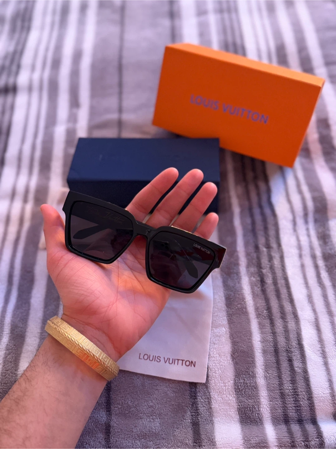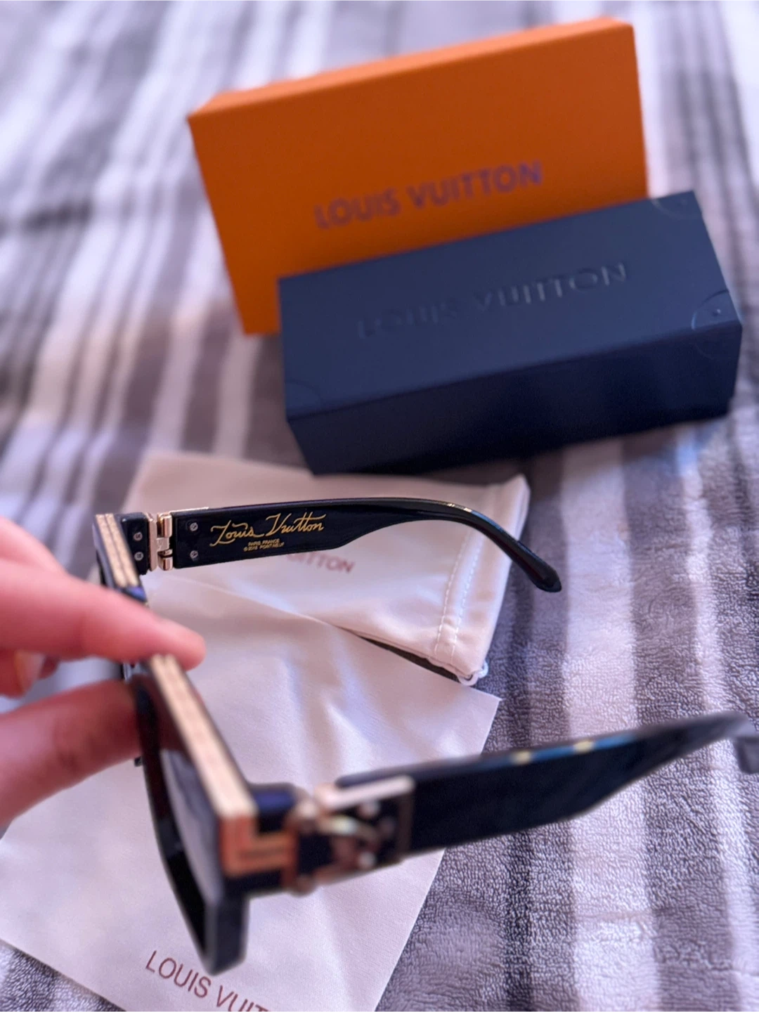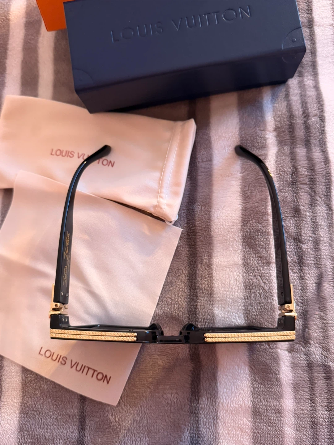 These are black Louis Vuitton sunglasses. They come with the original box and dust bag. They feature gold accents on the frames.