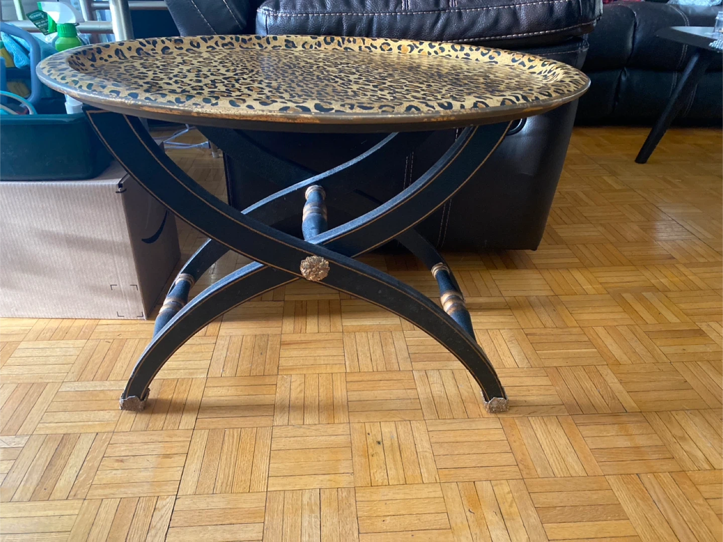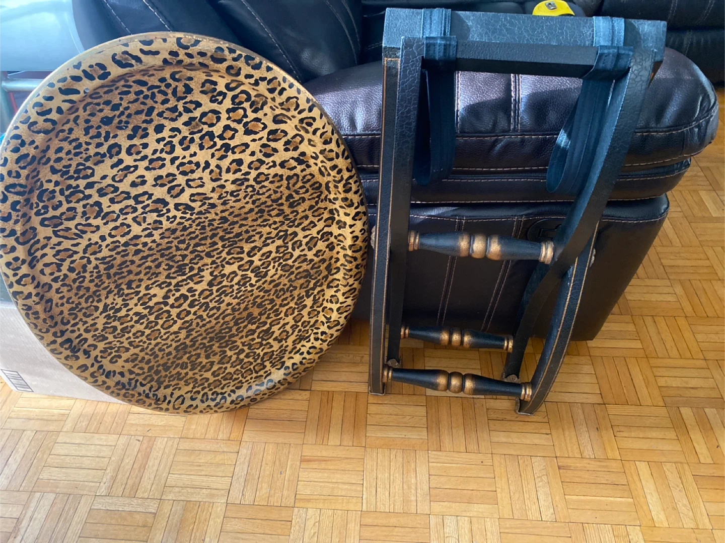 A decorative tray table with a leopard print surface. It features a black foldable base with gold accents. Perfect for adding a stylish touch to your living space!