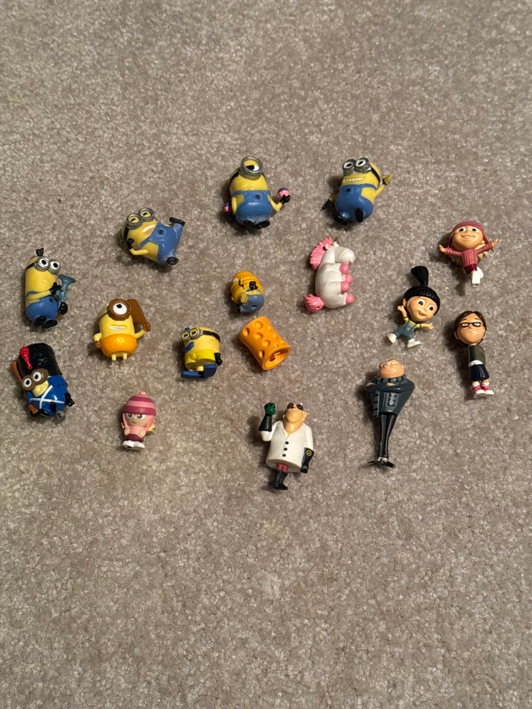 Collection of Despicable Me figurines. Includes minions, Agnes, a unicorn, and other characters. Small collectible toys. Good for fans of the movie.
