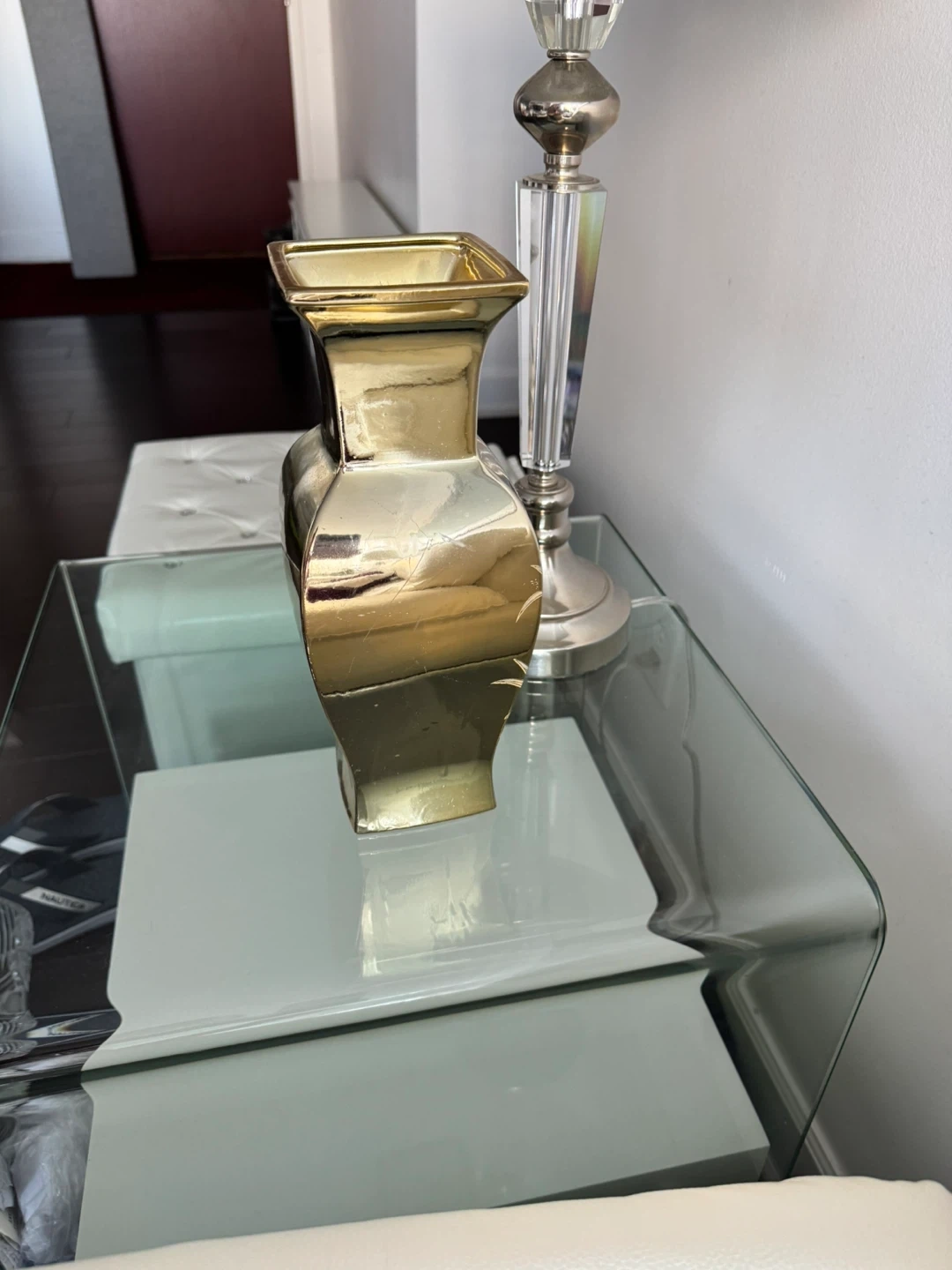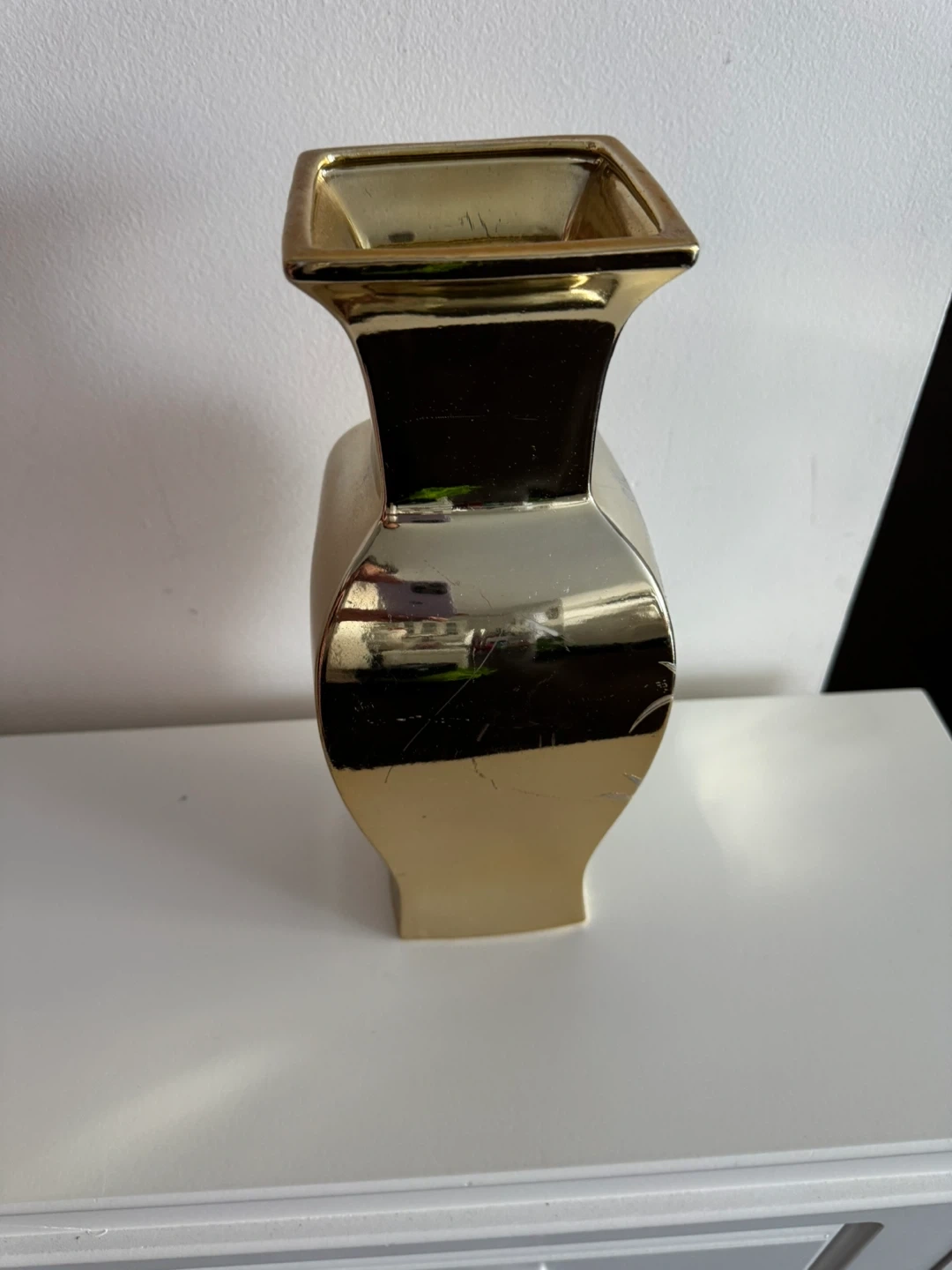 Shiny gold vase featuring a delicate silver floral and bird design. It has a unique square neck and a wider body. This vase would make a lovely decorative accent piece for any room!