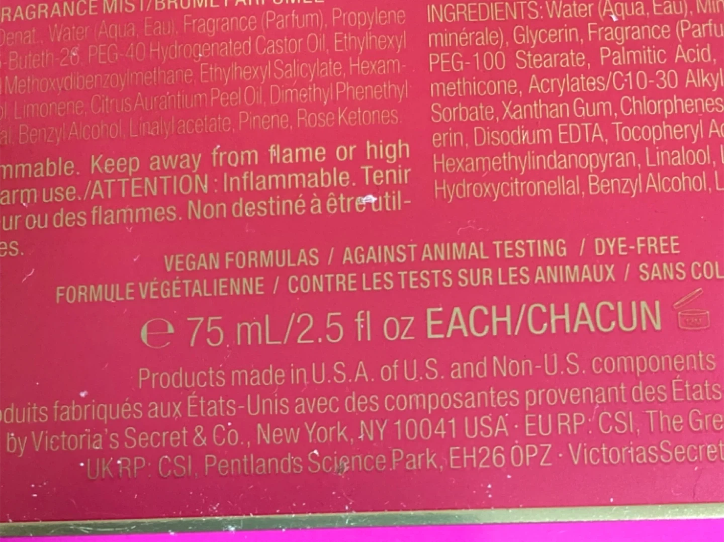 This Victoria's Secret Pure Seduction set includes a fragrance mist and a fragrance lotion. Each bottle is 75ml/2.5 fl oz. The scent notes are Juiced Plum, Crushed Freesia, and Sweet Vanilla.