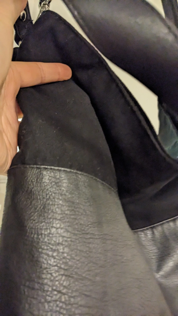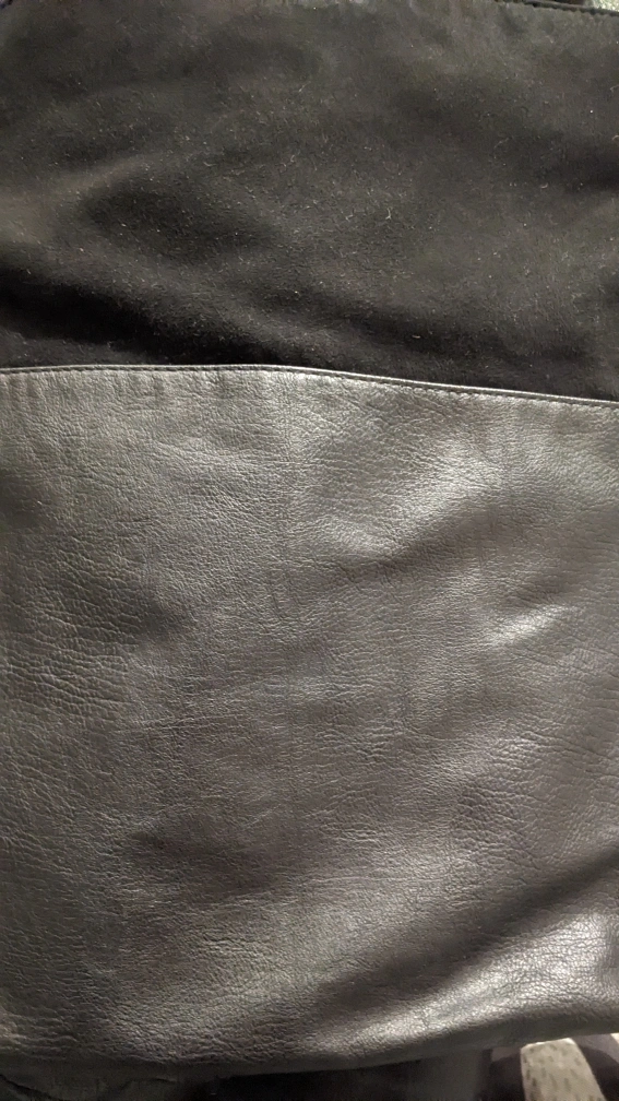 nice faux leather bag with suede accent on the top third of bag.