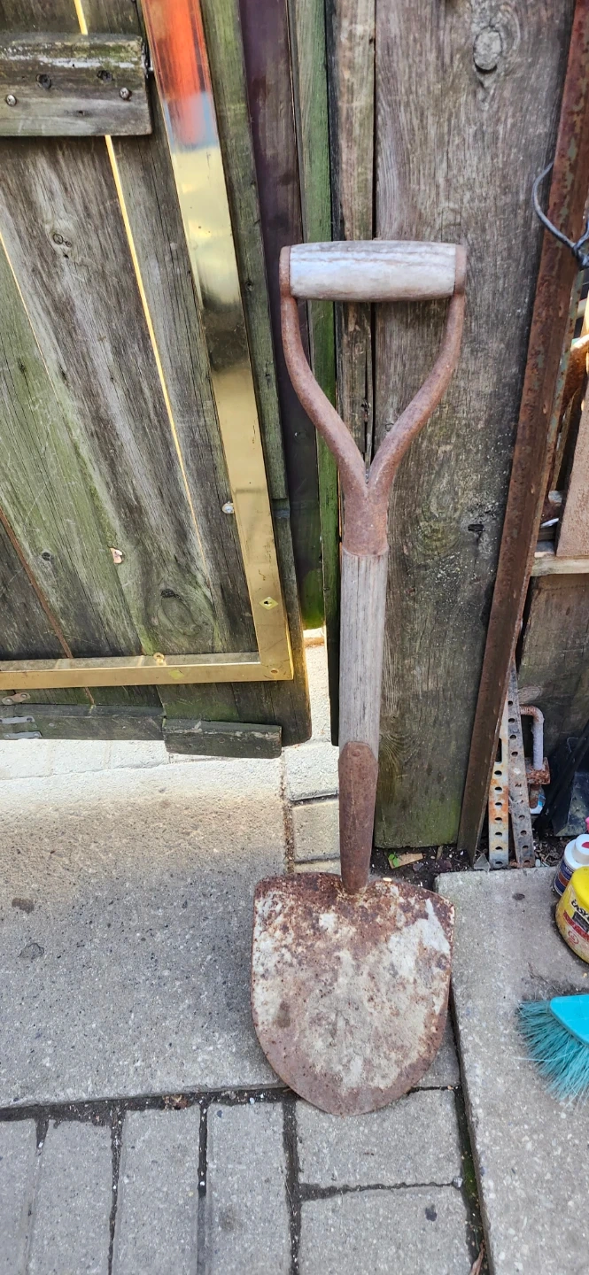 A classic garden shovel with a metal blade and a wooden D-handle. It's showing some rust from use. Perfect for digging and general yard work!. Price firm only cash no delivery only pickup 801 O'Connor drive outside TD Canada Trust bank door East York