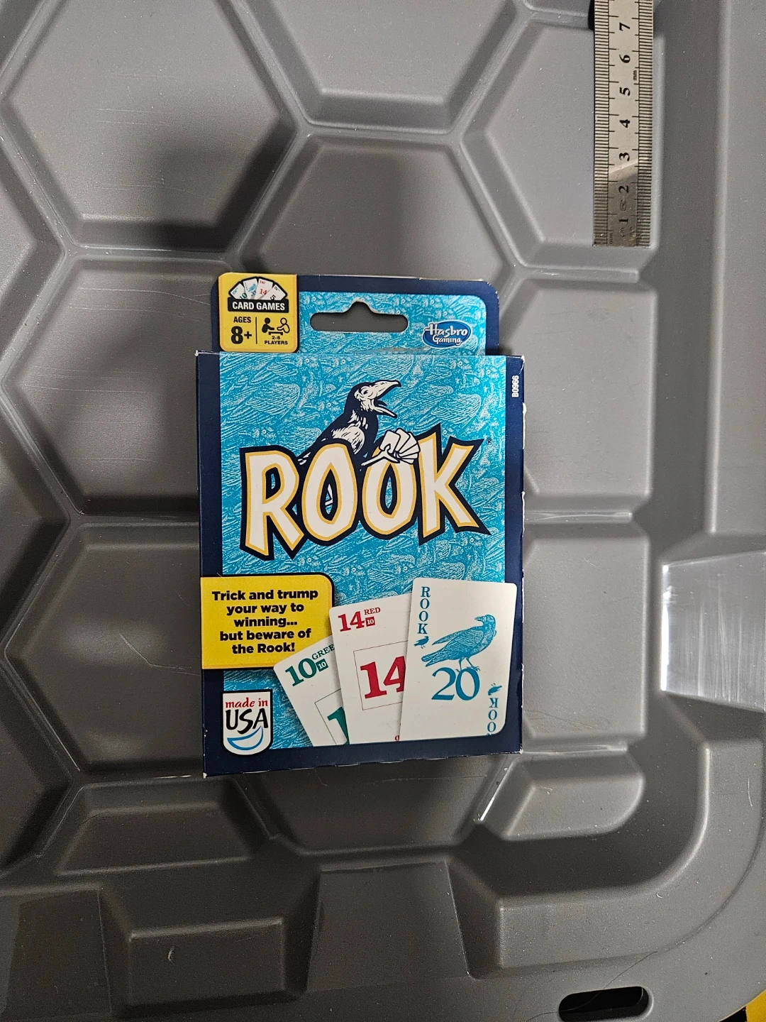 This is the classic Rook card game by Hasbro Gaming. It's designed for ages 8 and up, supporting 2-4 players. The game is made in the USA and includes a full deck of cards for trick-taking fun. It's a great way to enjoy a strategic card game with family and friends!