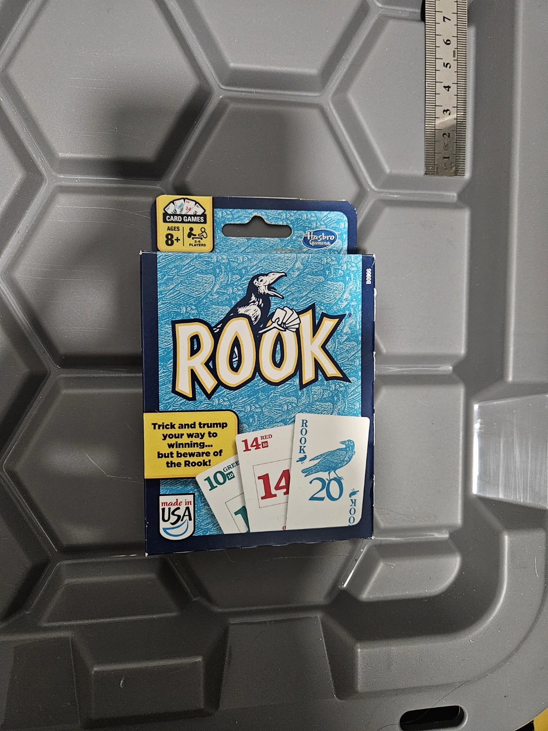 This is the classic Rook card game by Hasbro Gaming. It's designed for ages 8 and up, supporting 2-4 players. The game is made in the USA and includes a full deck of cards for trick-taking fun. It's a great way to enjoy a strategic card game with family and friends!