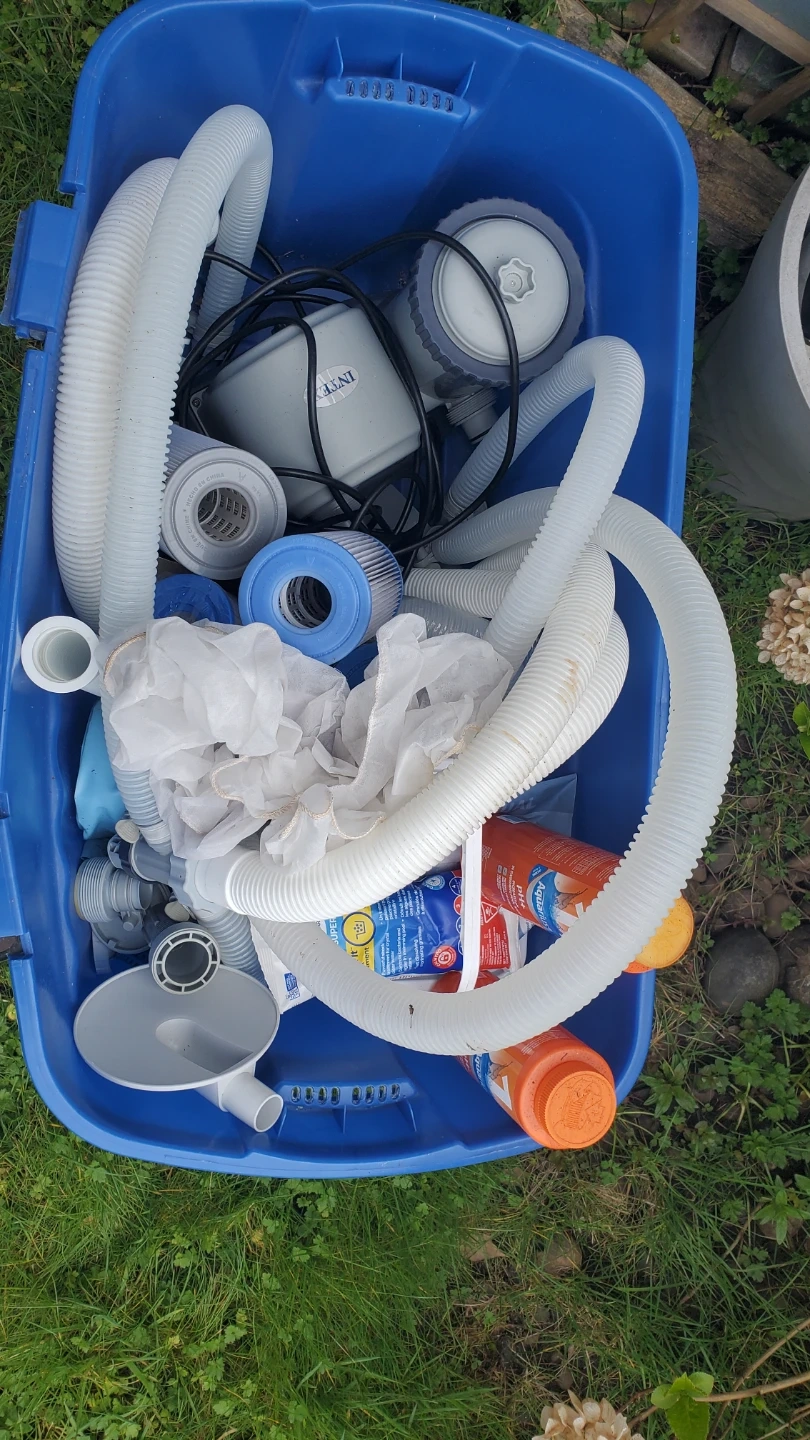 This is an Intex pool filter pump system, likely for an above-ground pool. It comes with various hoses, filter cartridges, and other accessories to help keep your pool clean. Great for maintaining a sparkling pool all summer long!