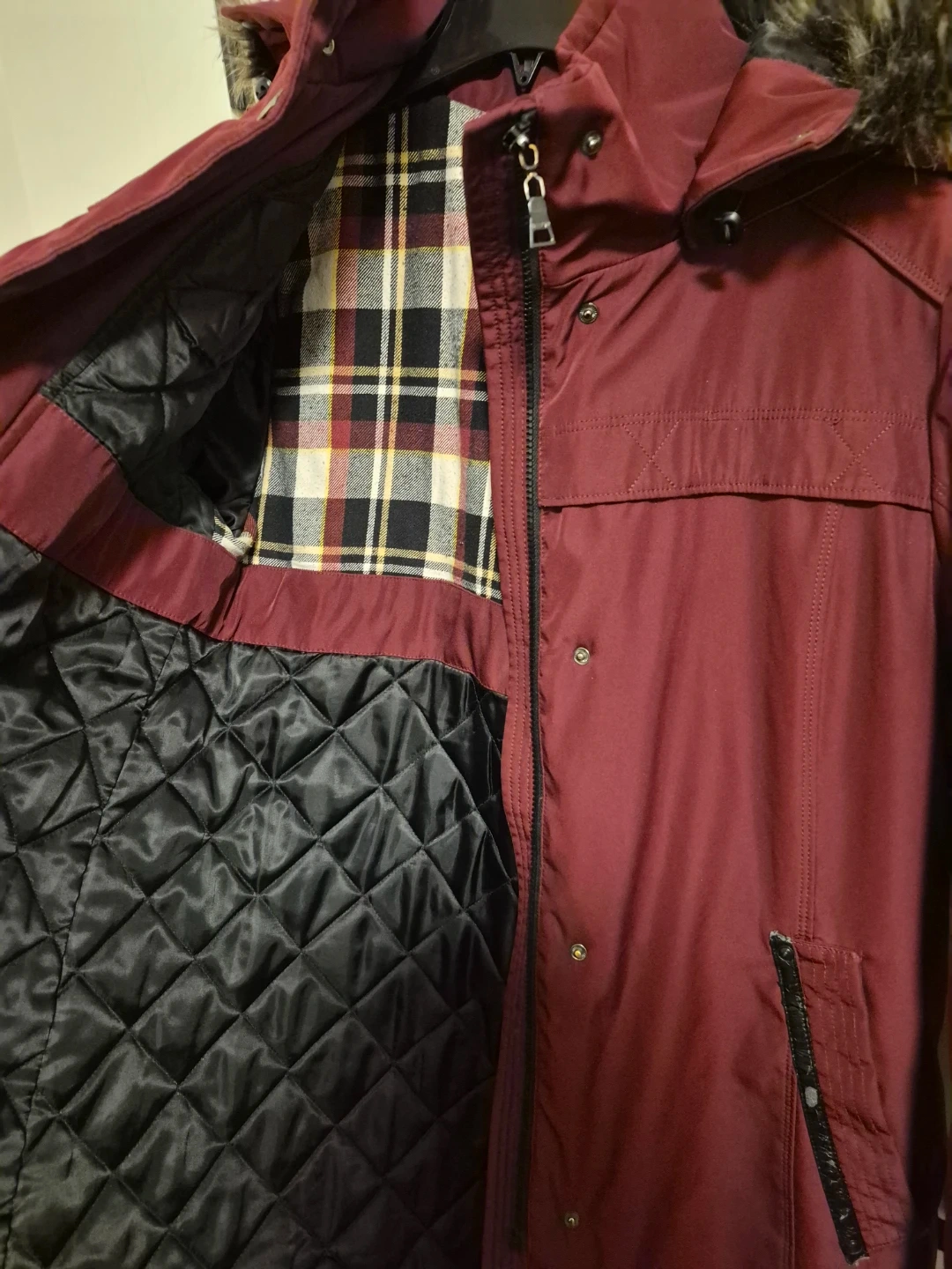 This maroon parka is designed for warmth and style. It features a cozy plaid-lined hood and a quilted interior for extra insulation. Two zippered pockets . Just a stain in the front otherwise it is very warm and soft.