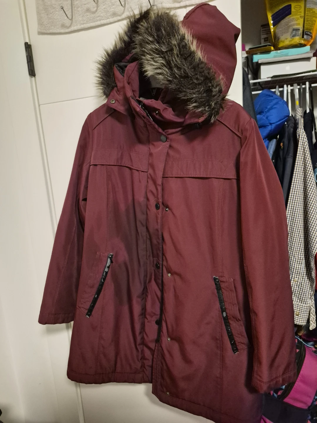 This maroon parka is designed for warmth and style. It features a cozy plaid-lined hood and a quilted interior for extra insulation. Two zippered pockets . Just a stain in the front otherwise it is very warm and soft.