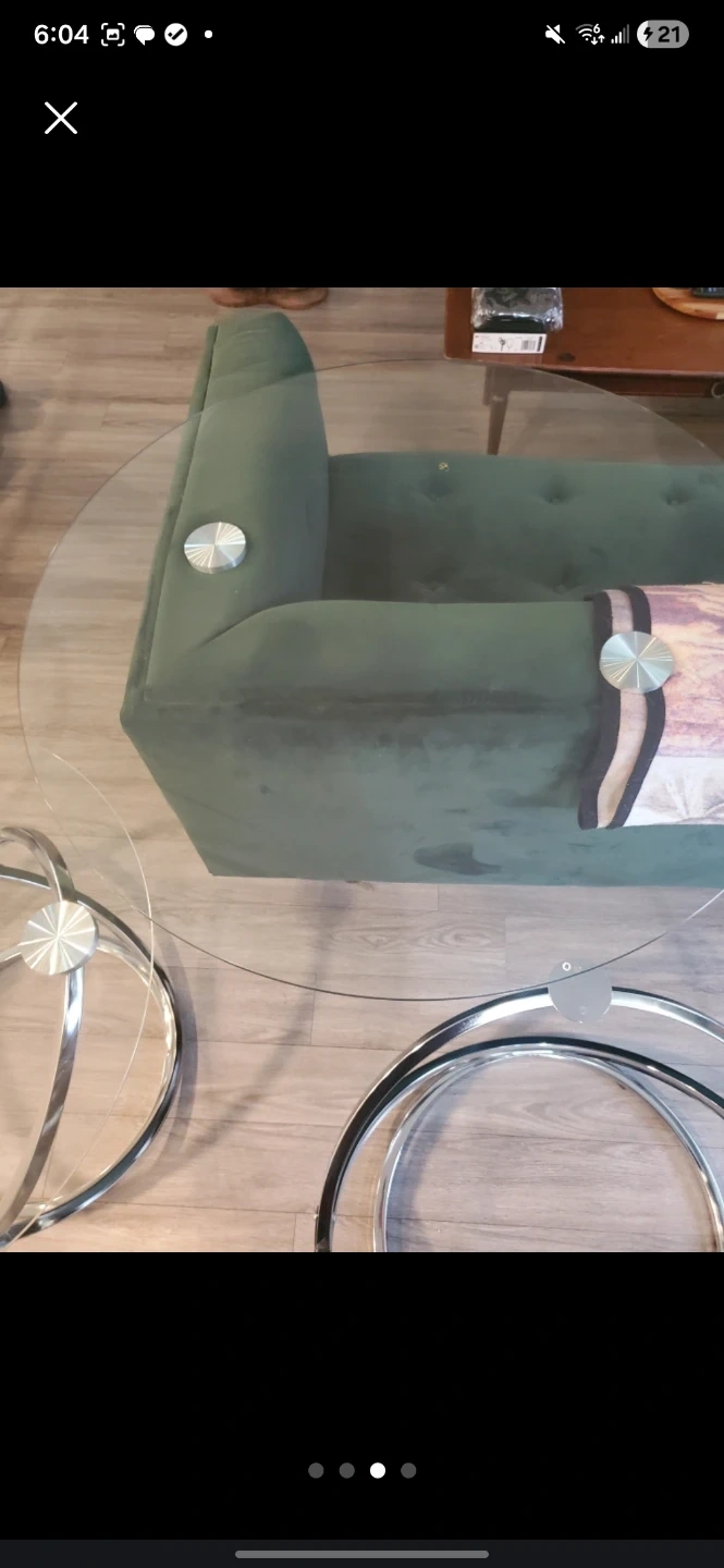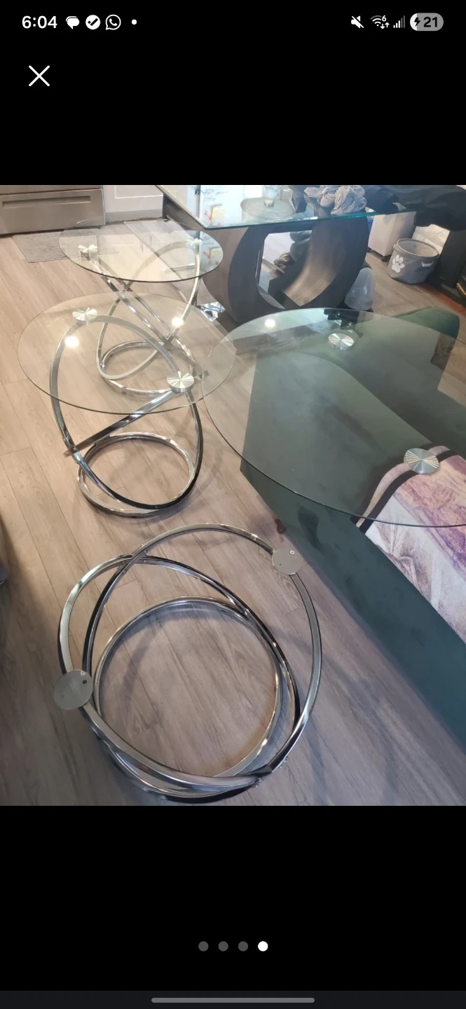 Selling a set of unique glass top coffee and side tables with a modern, swirling chrome base. Great for adding a touch of contemporary style to your living room or den!