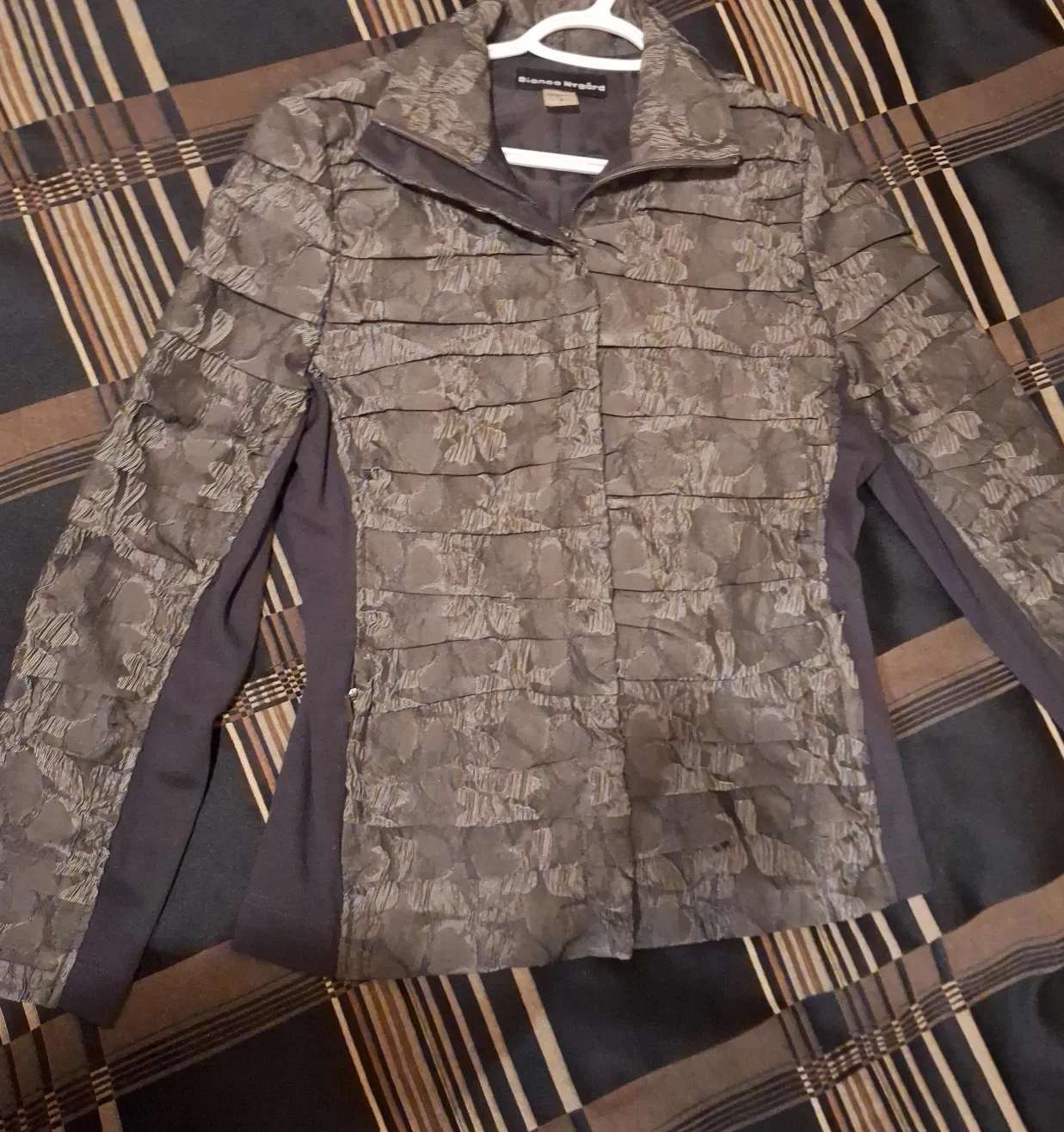 This textured jacket from Bianca Nygard has a unique layered design. It features a dark grey, textured outer fabric with contrasting solid dark grey sleeves and side panels. Zipper closure.