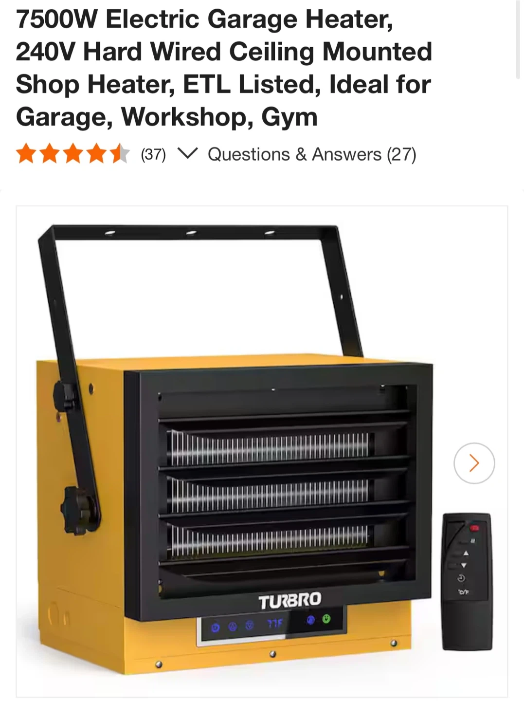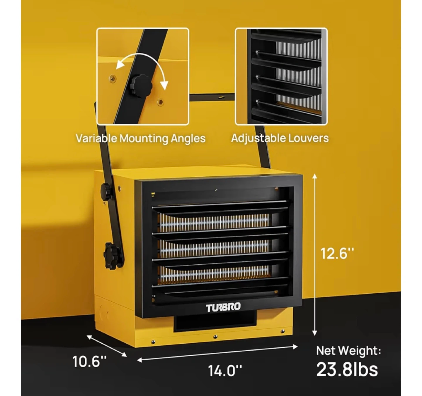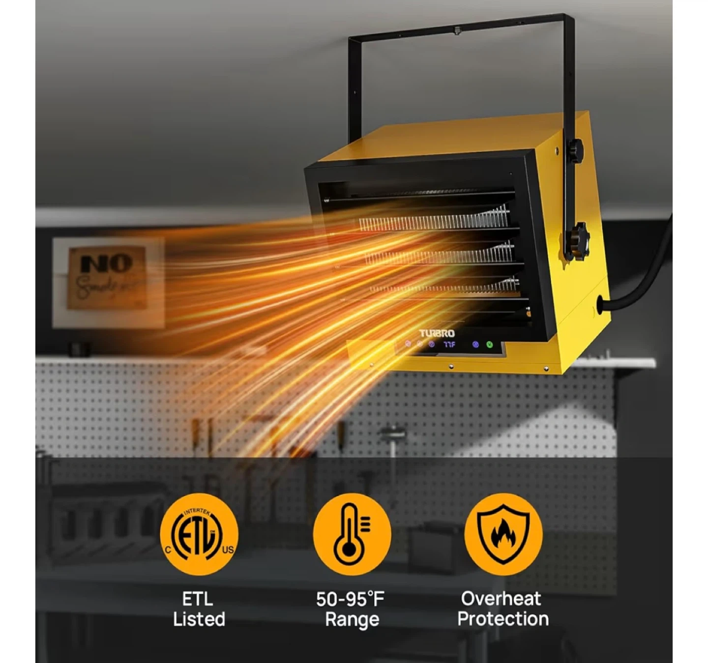 This TURBRO electric heater offers fan-forced heating for spaces up to 1,500 sq. ft. It has a temperature range of 50-95°F and features adjustable louvers and variable mounting angles. Overheat protection and ETL listing provide safety.