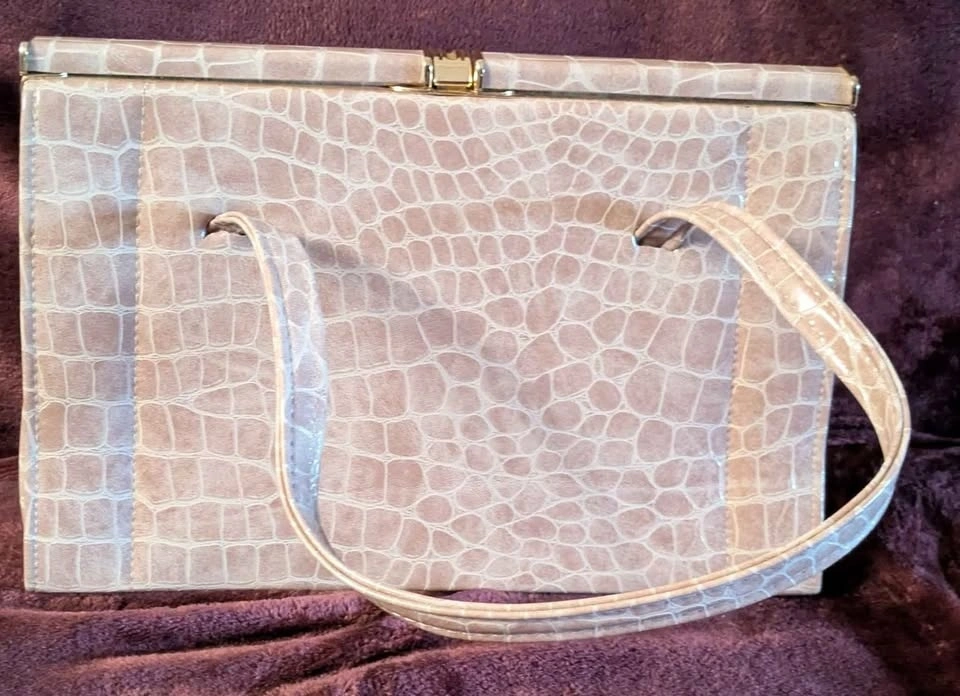 This vintage purse is in fantastic condition. It contains two zippered compartments inside and one open pouch, with the zippered compartments dividing the inner purse for convenient organization. The exterior is a pale brown/cream with brass details for the clasp and hinges. Estimated to be from the 1960s. Pickup available near Lawrence East and Midland in Scarborough.