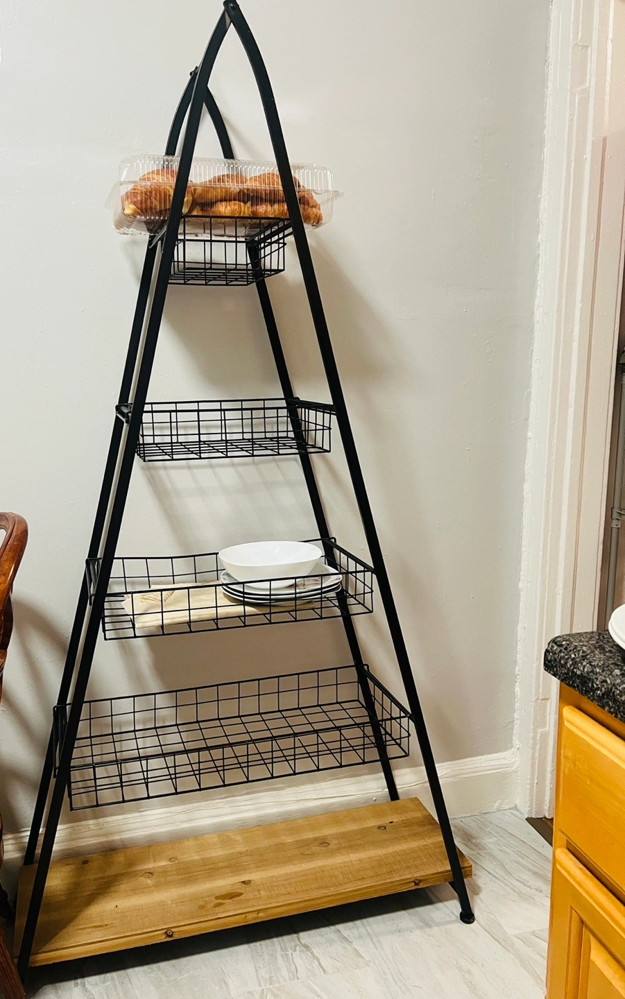 A Frame Tower With Wire Baskets And and 1 Wooden shelf. Great for storage or display in your kitchen or living room.