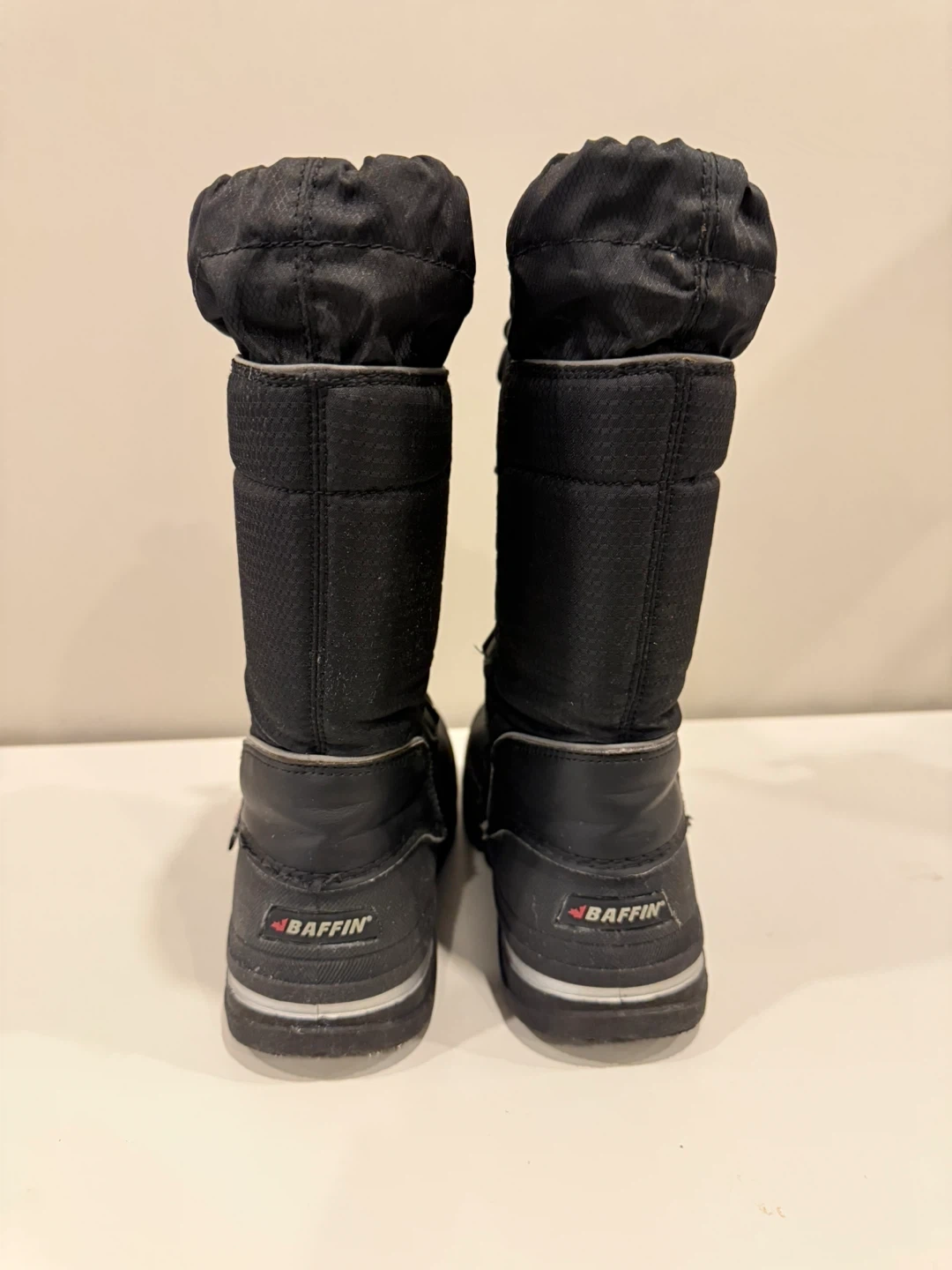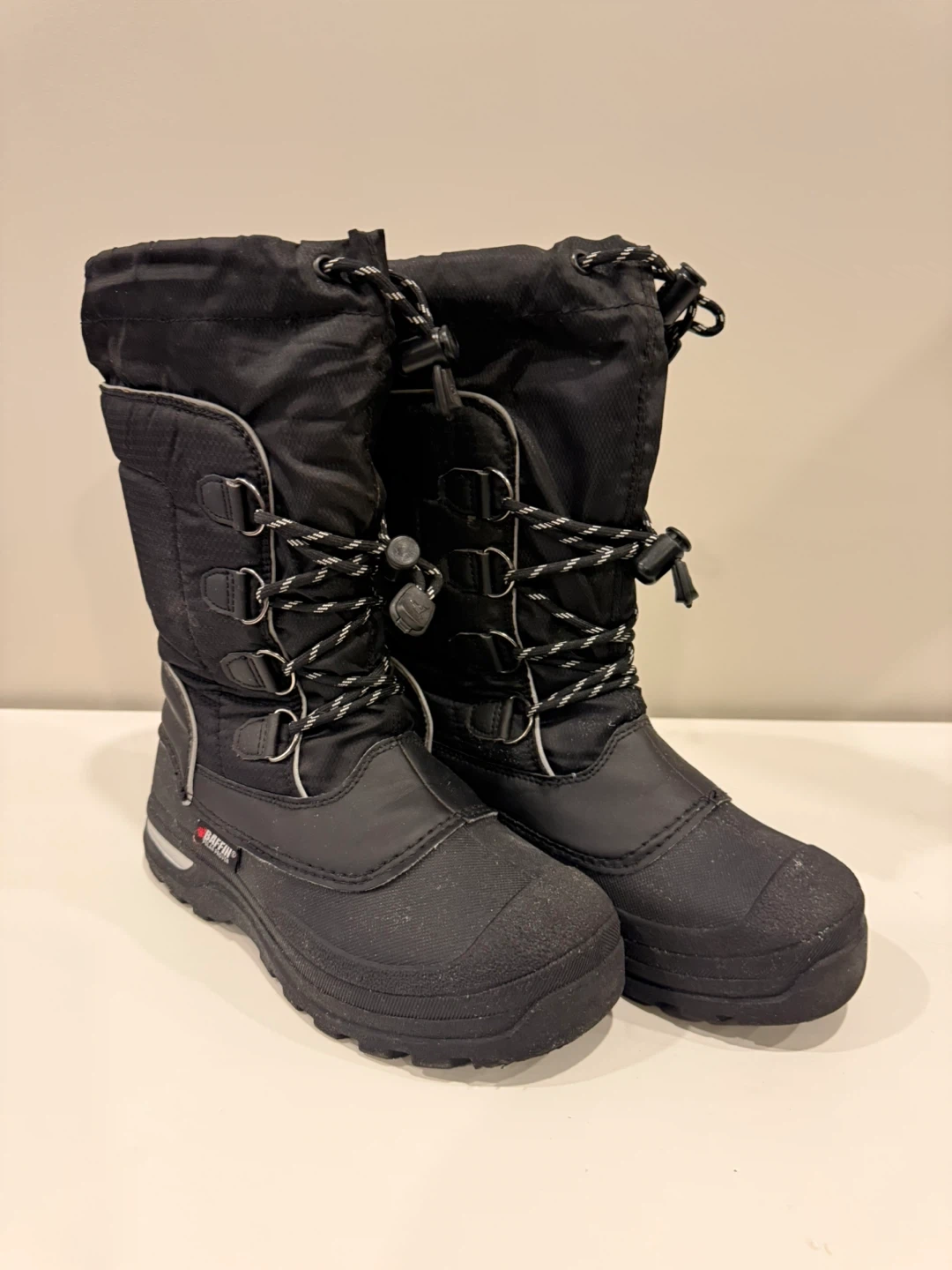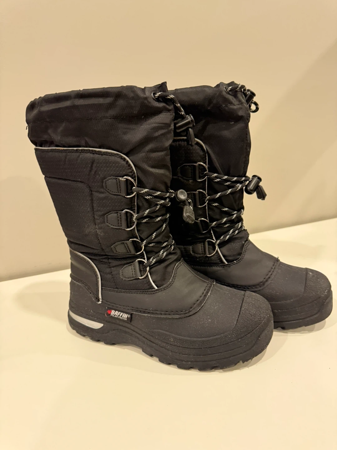 Lightly used Black Baffin snow boots with a rugged sole for traction. These boots are designed for cold weather. They feature a drawstring closure at the top for a snug fit.