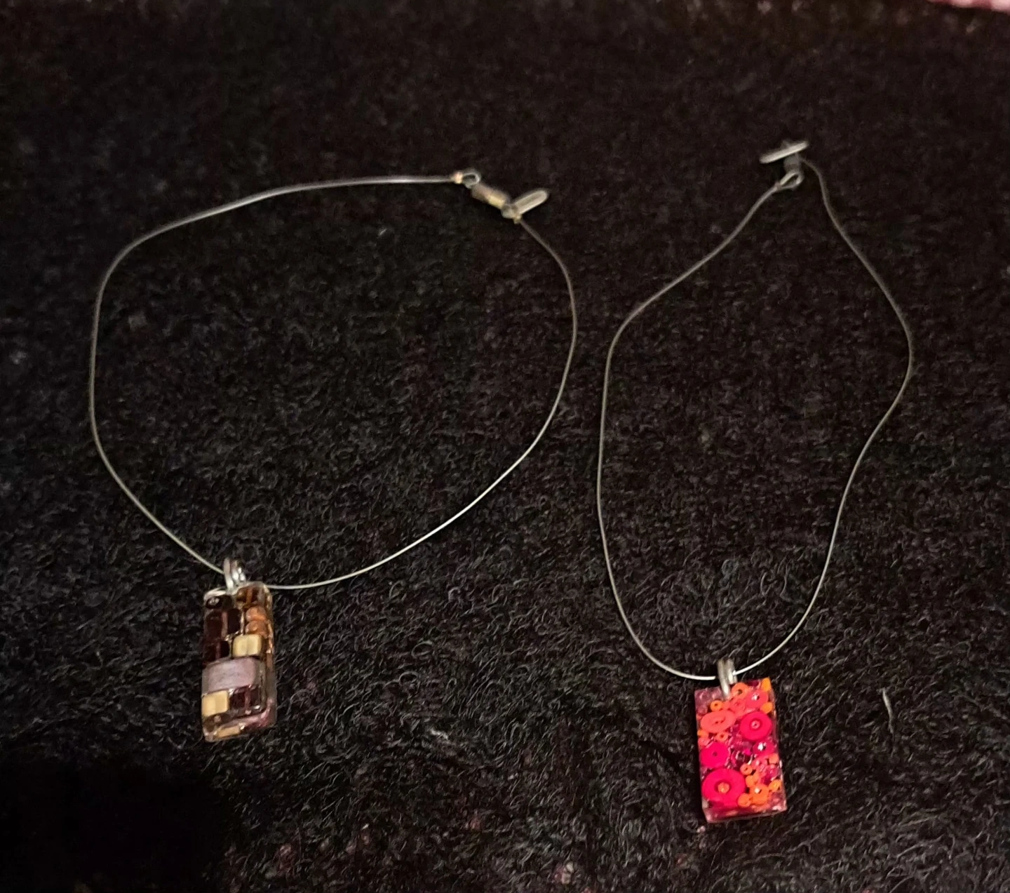 Two unique handmade Sadie necklaces, each with a distinct pendant from the One of a kind show. One pendant features a mosaic of brown and tan elements, while the other showcases vibrant pink and red floral patterns. Both are suspended from thin, 925 silver wires with adjustable clasps.