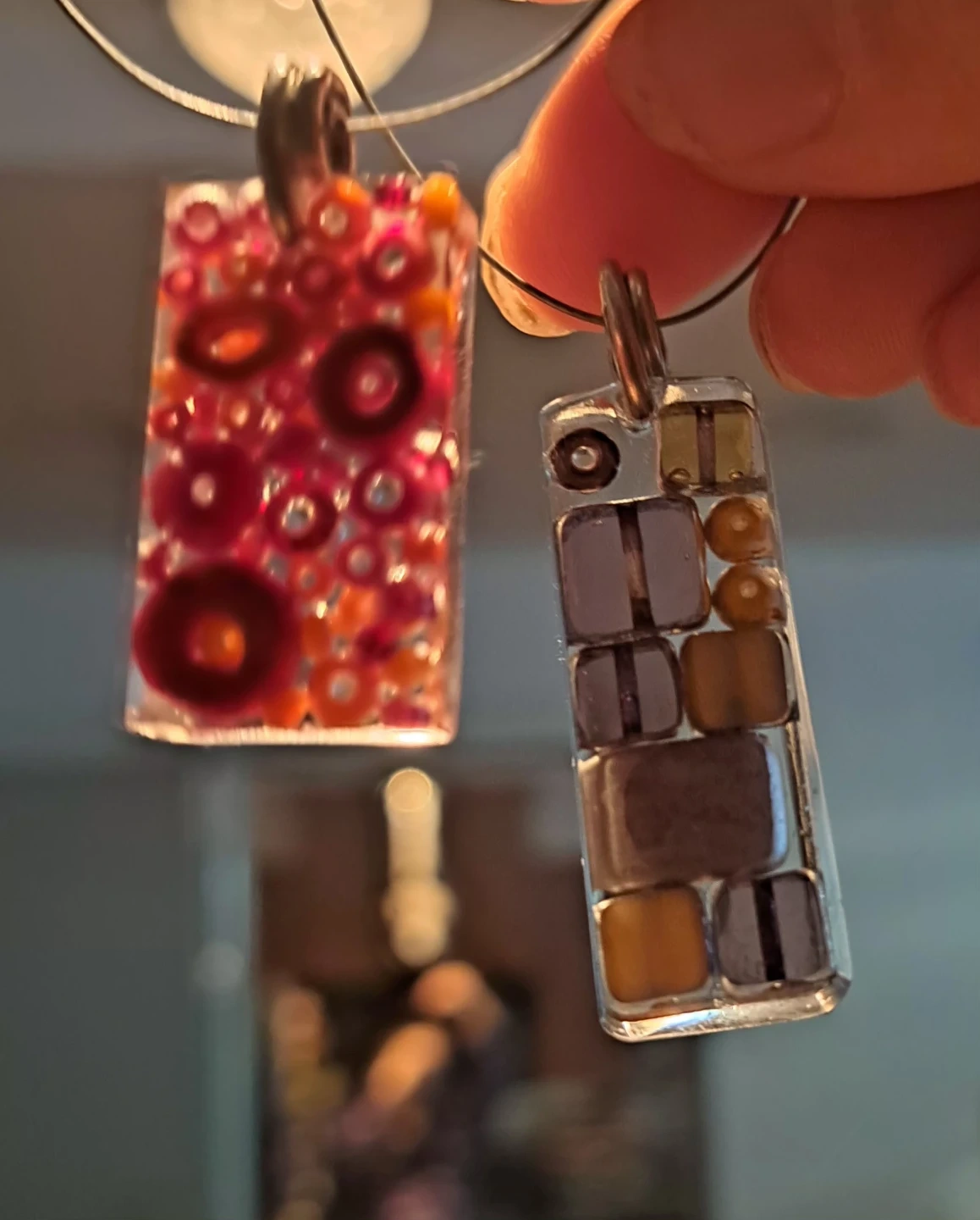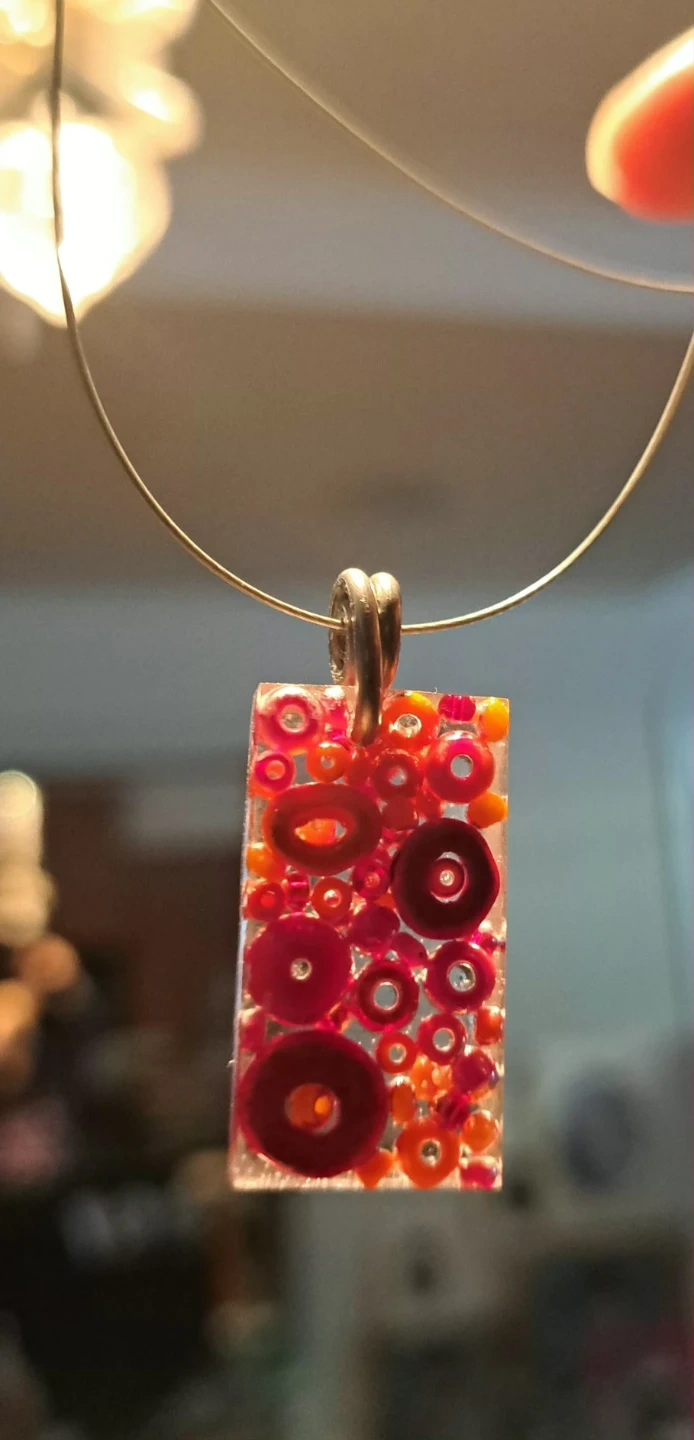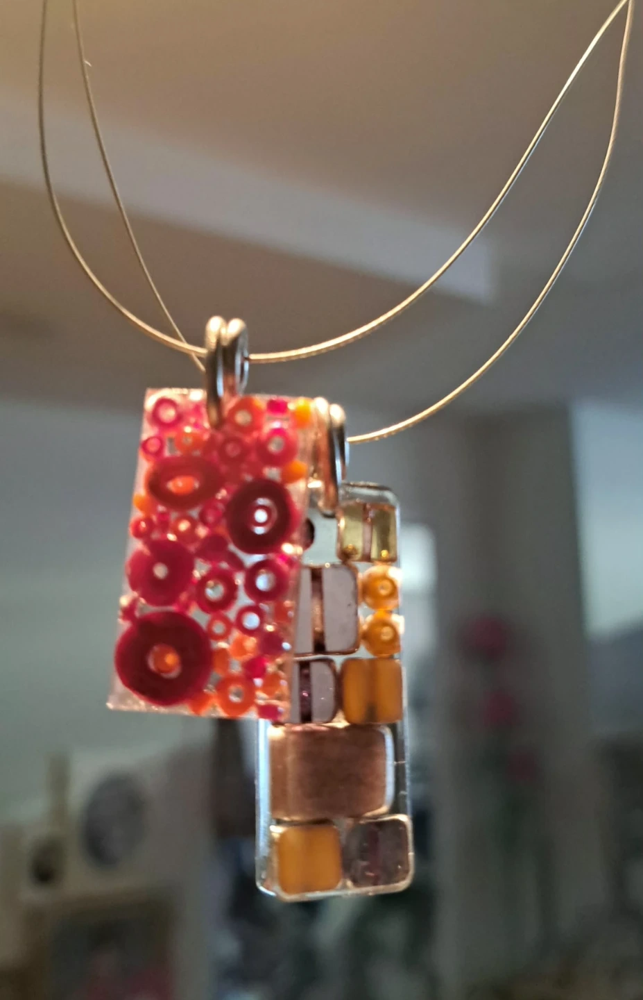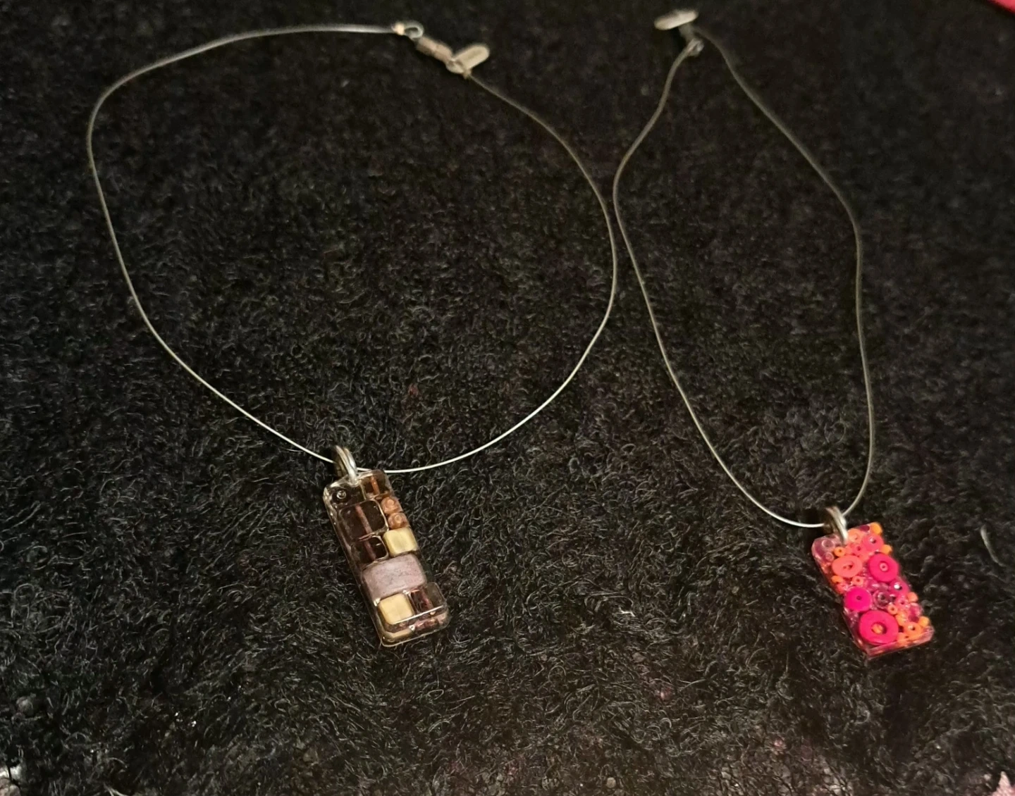 Two unique handmade Sadie necklaces, each with a distinct pendant from the One of a kind show. One pendant features a mosaic of brown and tan elements, while the other showcases vibrant pink and red floral patterns. Both are suspended from thin, 925 silver wires with adjustable clasps.