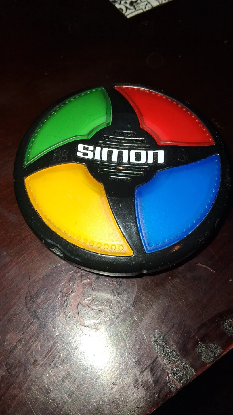 Classic Simon electronic memory game with red, green, blue, and yellow buttons. Requires batteries, which it has batteries in it, that work. Test your memory with sequences of lights and sounds!