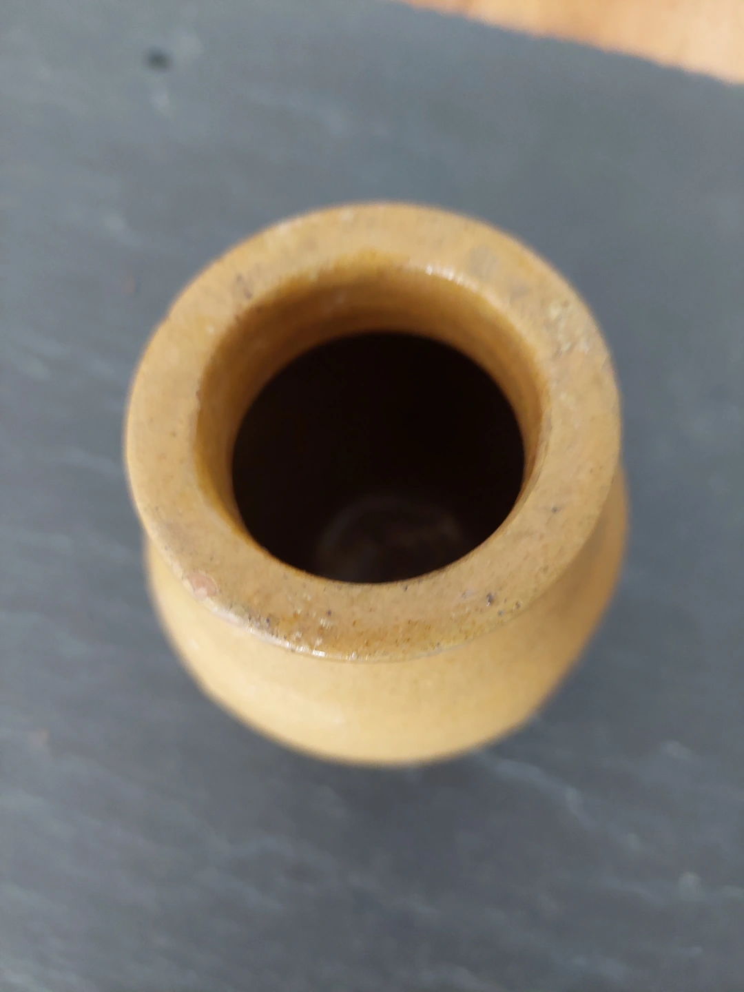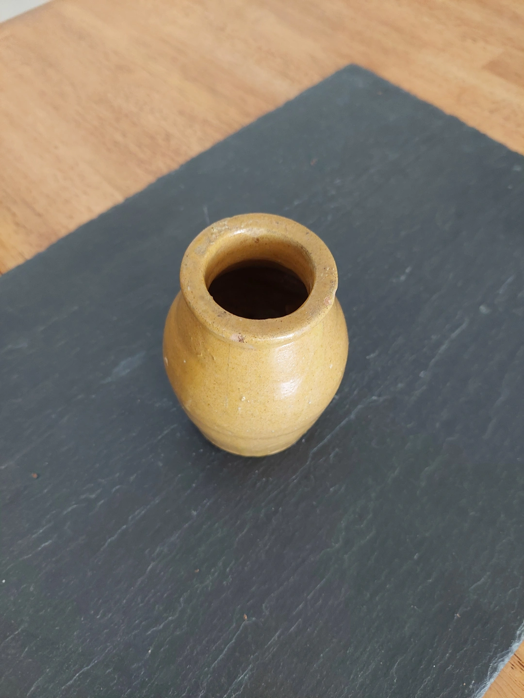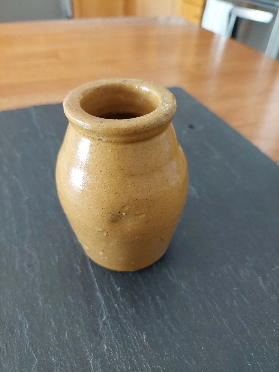 Selling a small ceramic jar. It's a cute little piece that could be used for a variety of things. There are some signs of wear and use, but it is still in good condition.