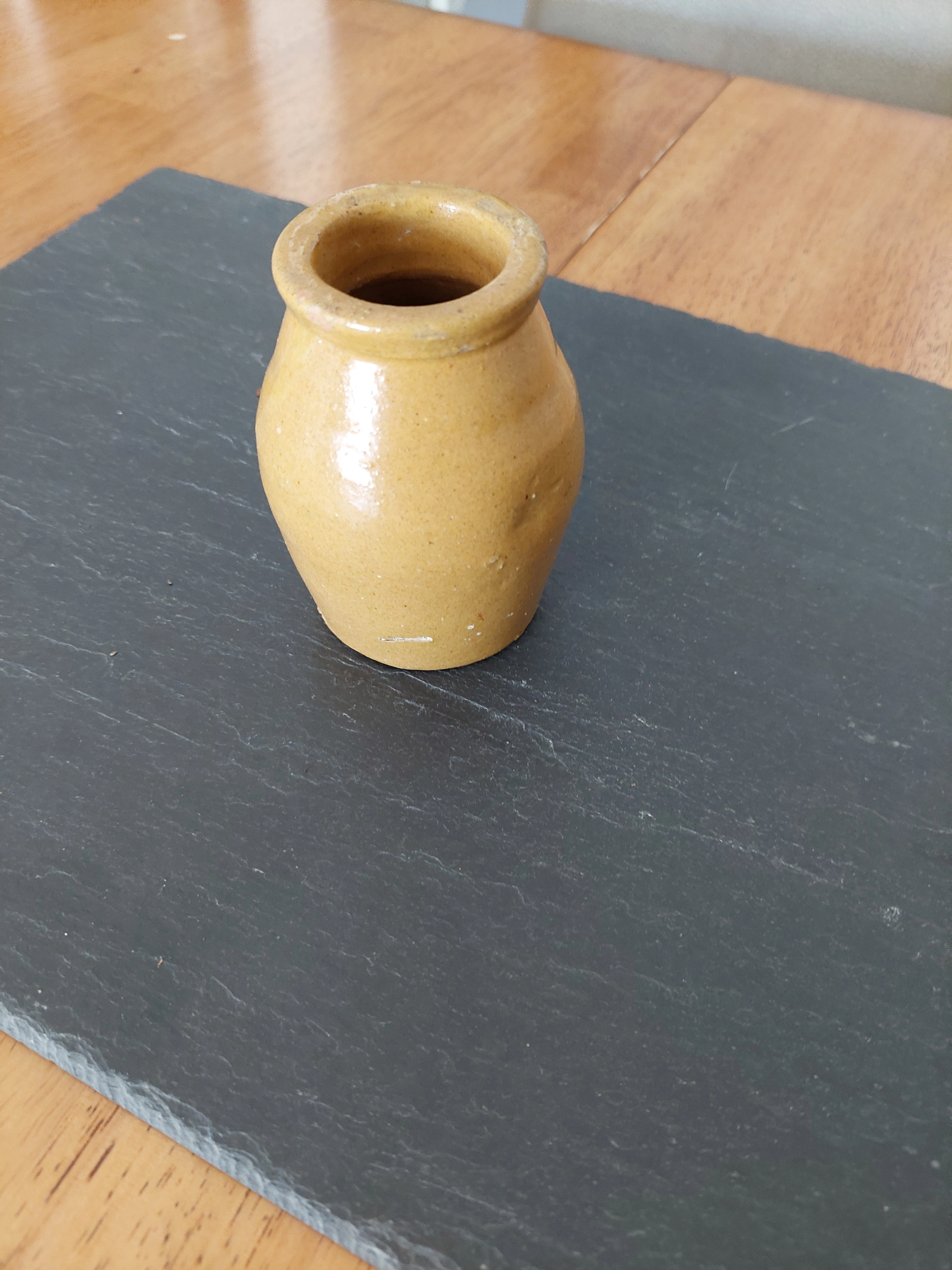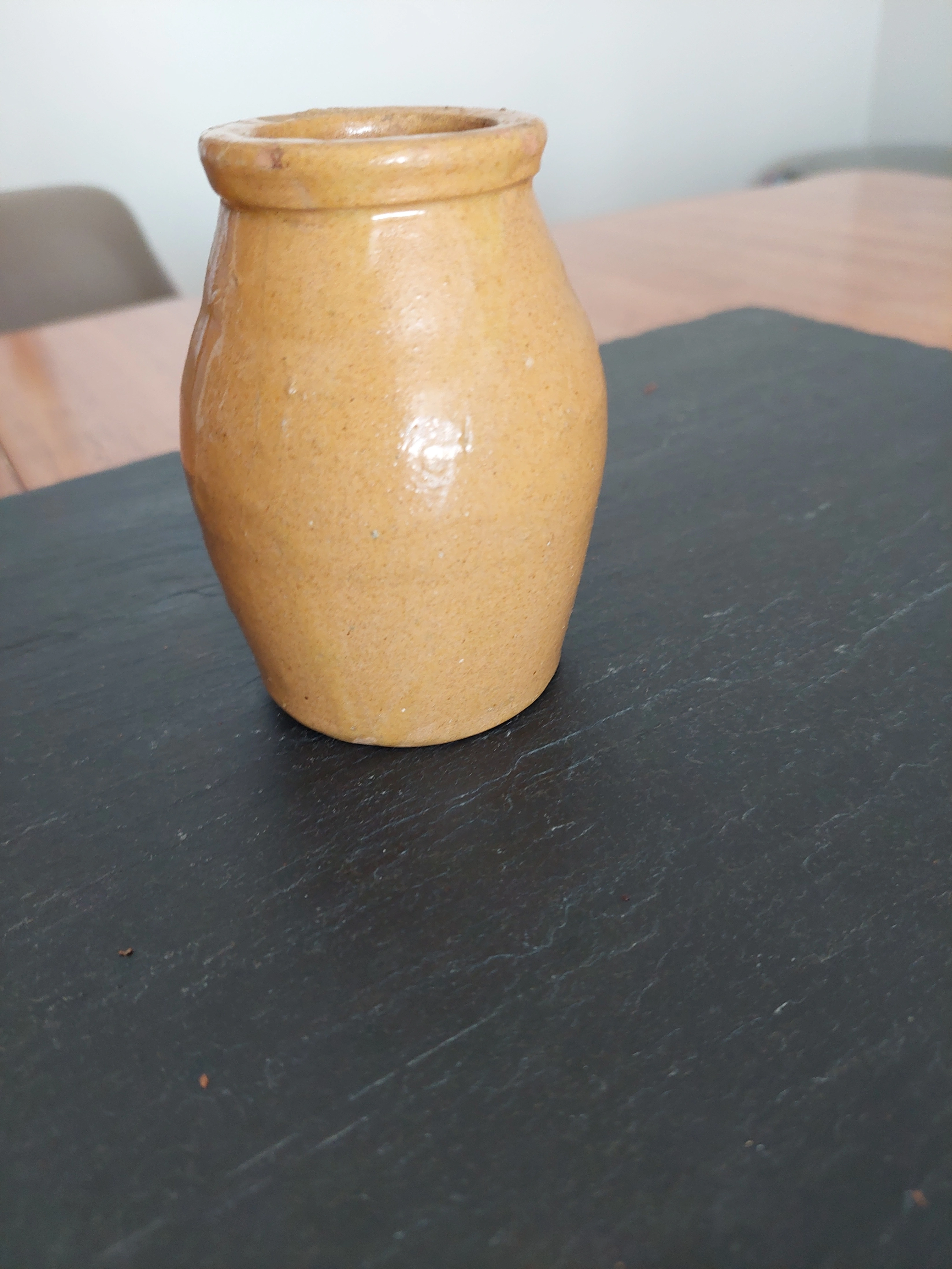 Selling a small ceramic jar. It's a cute little piece that could be used for a variety of things. There are some signs of wear and use, but it is still in good condition.