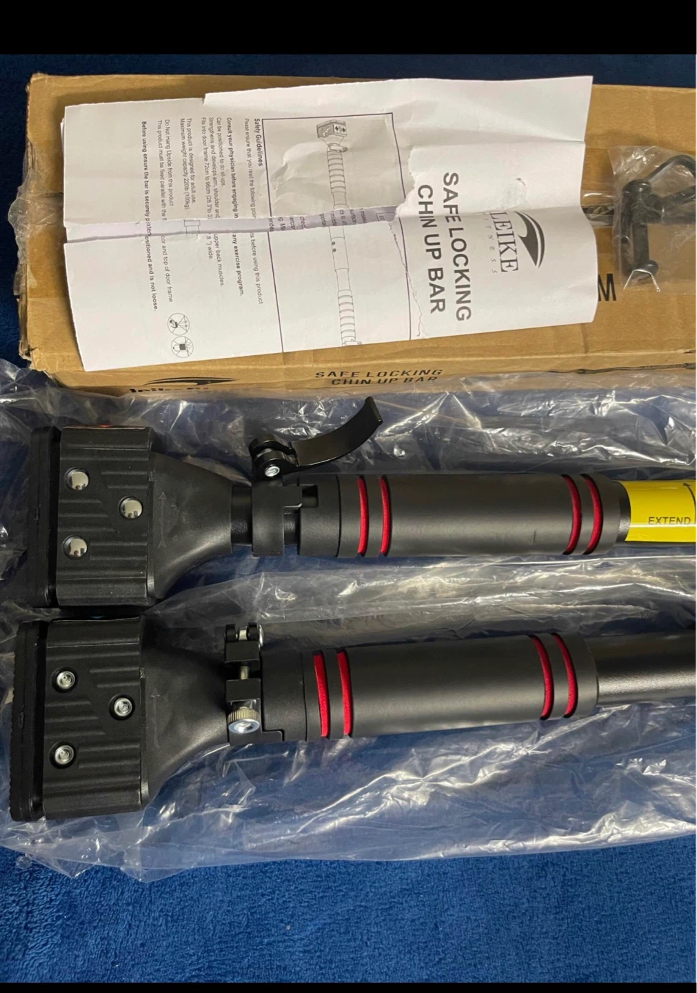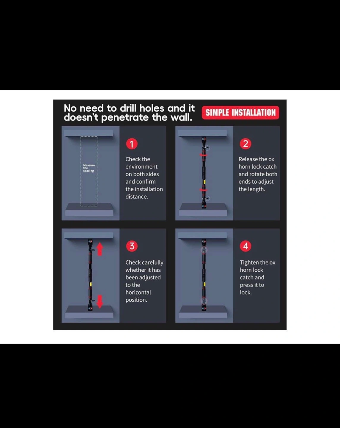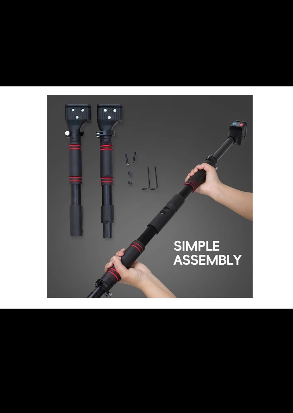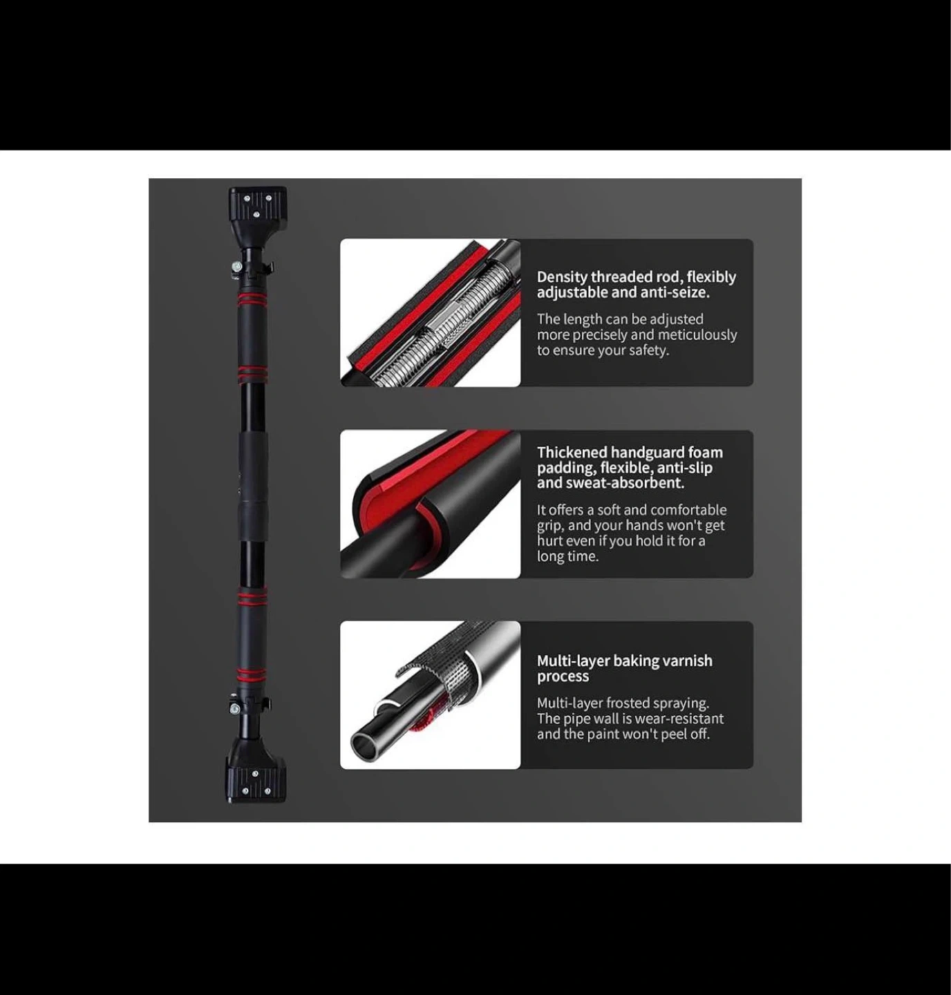 This pull-up bar features a drill-free, self-locking design with a telescopic composite steel pipe for adjustable length. It has a rubber anti-slip base and thickened handguard foam padding for comfort and safety. Suitable for solid wood door frames, security doors, and smooth corridor walls. Great for home workouts!
