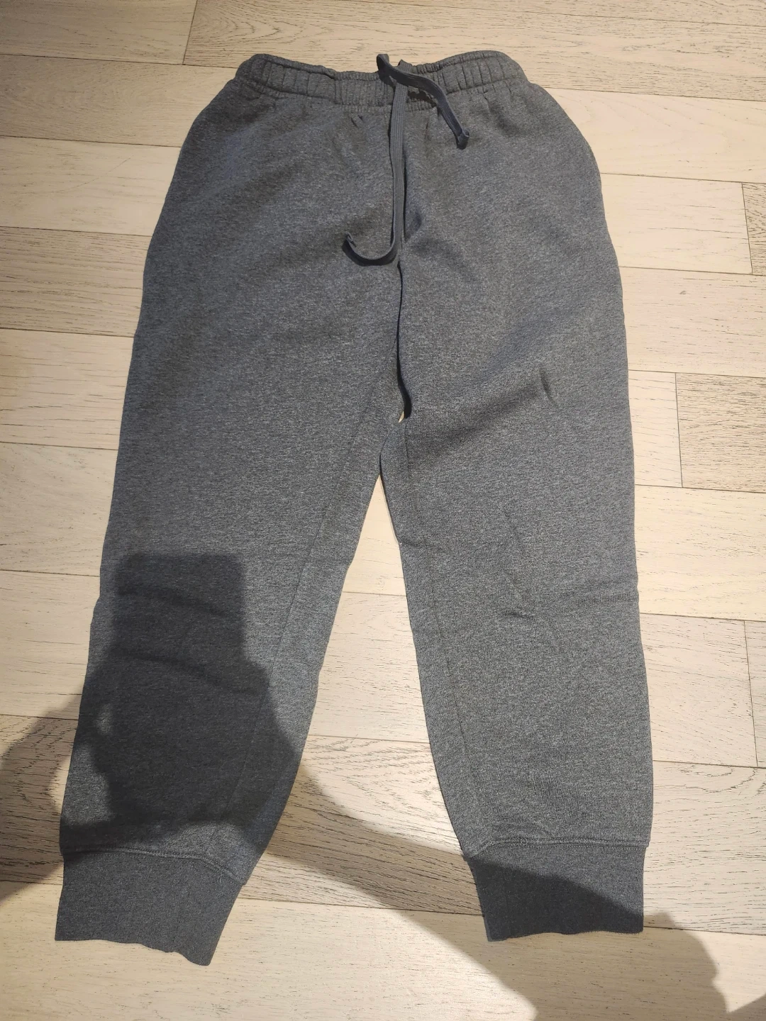 These grey sweatpants feature a comfortable drawstring waist. They're made from a soft fabric blend. These pants are perfect for casual wear or lounging.