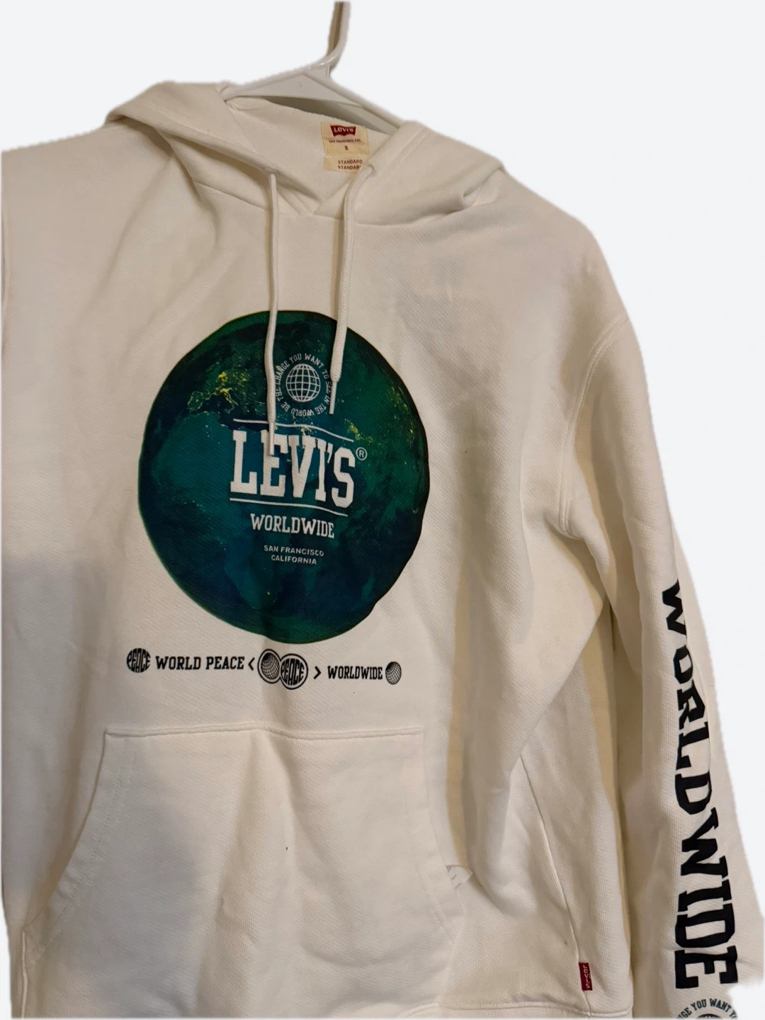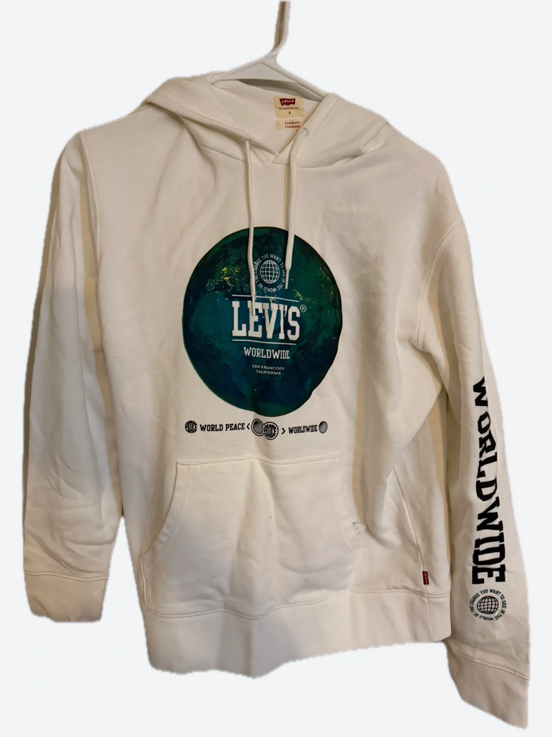 This white Levi's hoodie features a bold graphic of the Earth with "WORLDWIDE" text. It's made from a comfortable cotton blend. The "WORLDWIDE" graphic also appears on the sleeve. This hoodie is perfect for casual wear.