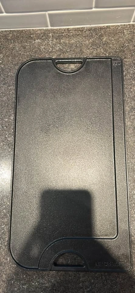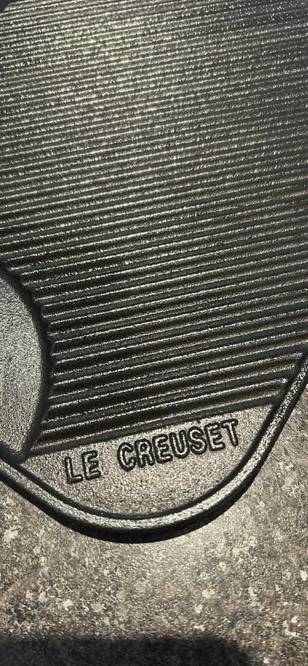 Le Creuset reversible enameled cast iron grill/griddle. Turns your stovetop into a grill in seconds. Grooved side creates beautiful grill marks for meats, fish, and skewers; smooth side is perfect for pancakes, eggs, and more. Extra-large 18½" x 10" size with built-in handles. Handmade in France. Paid over $320. Excellent condition.