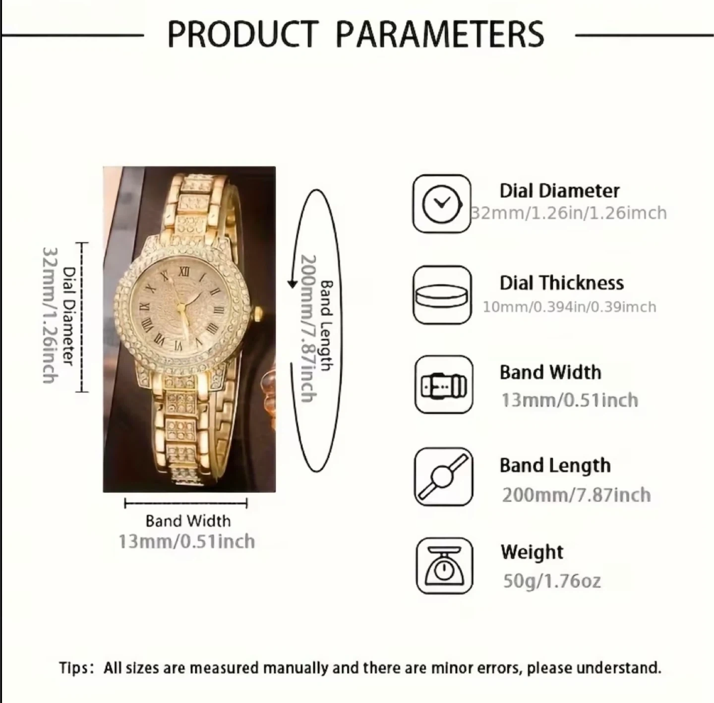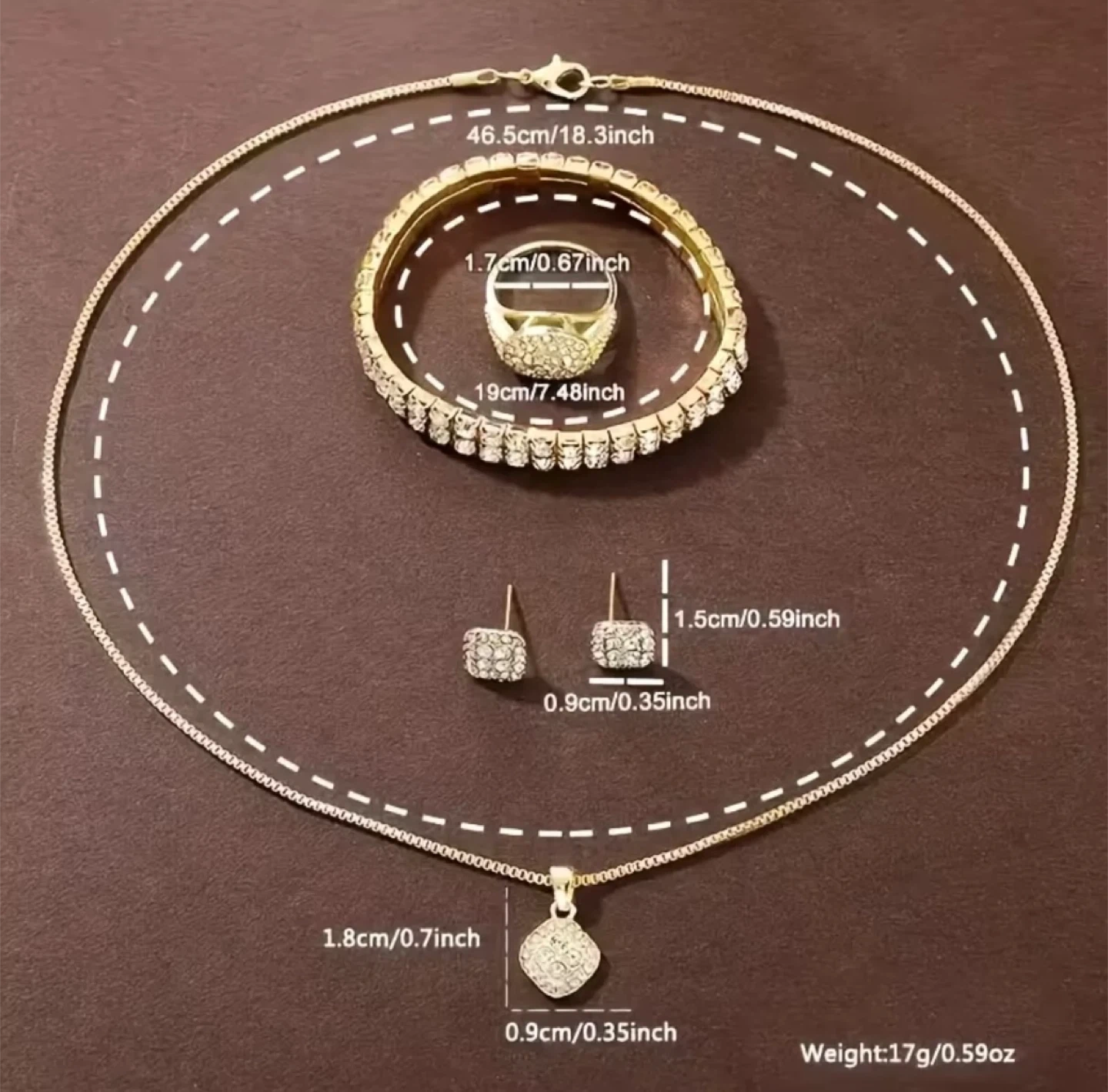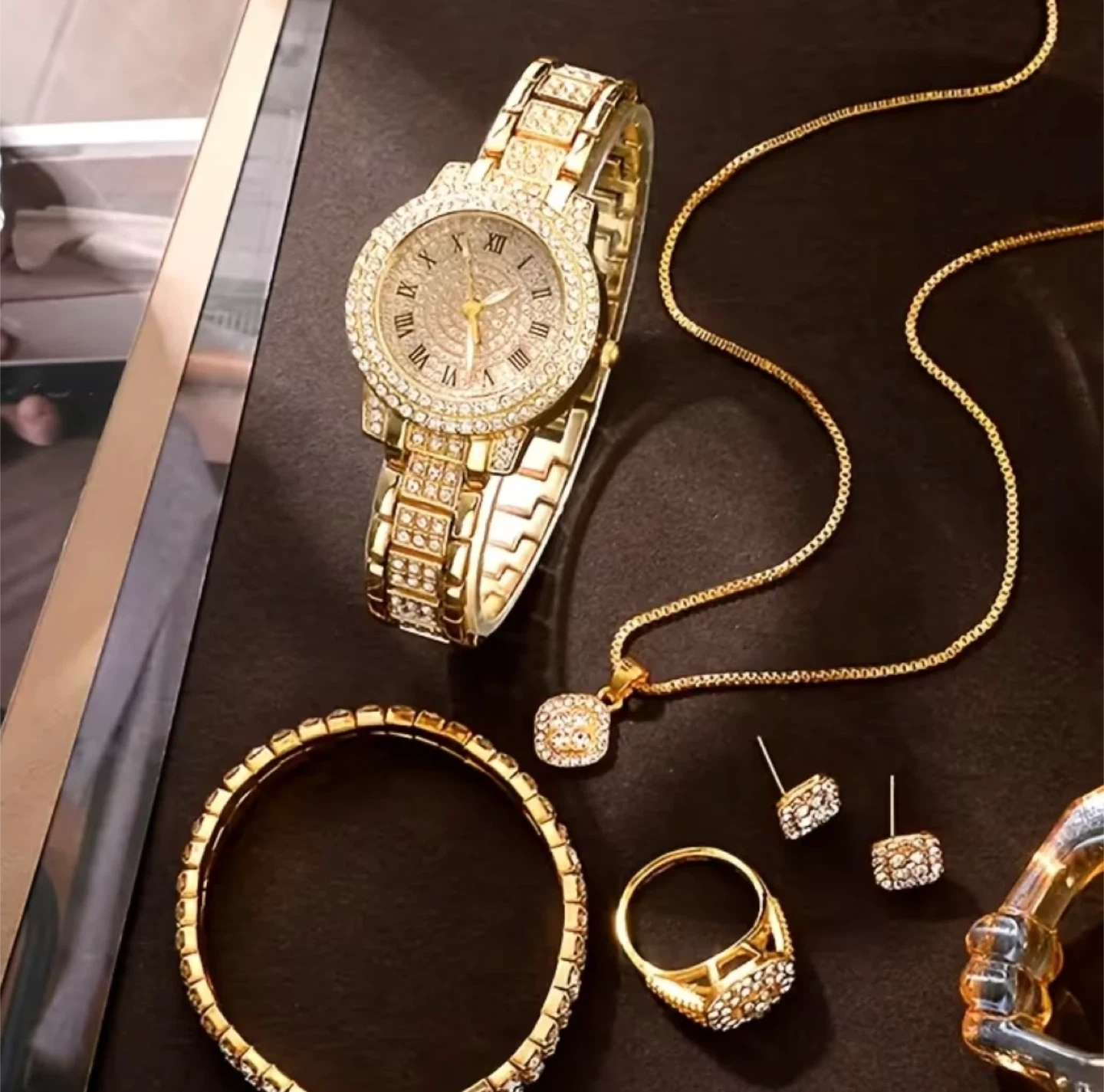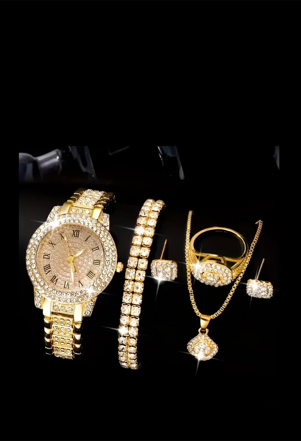 New, never worn, box not included. This dazzling set includes a quartz watch with a gold-tone band and a matching necklace, bracelet, ring, and earrings.
