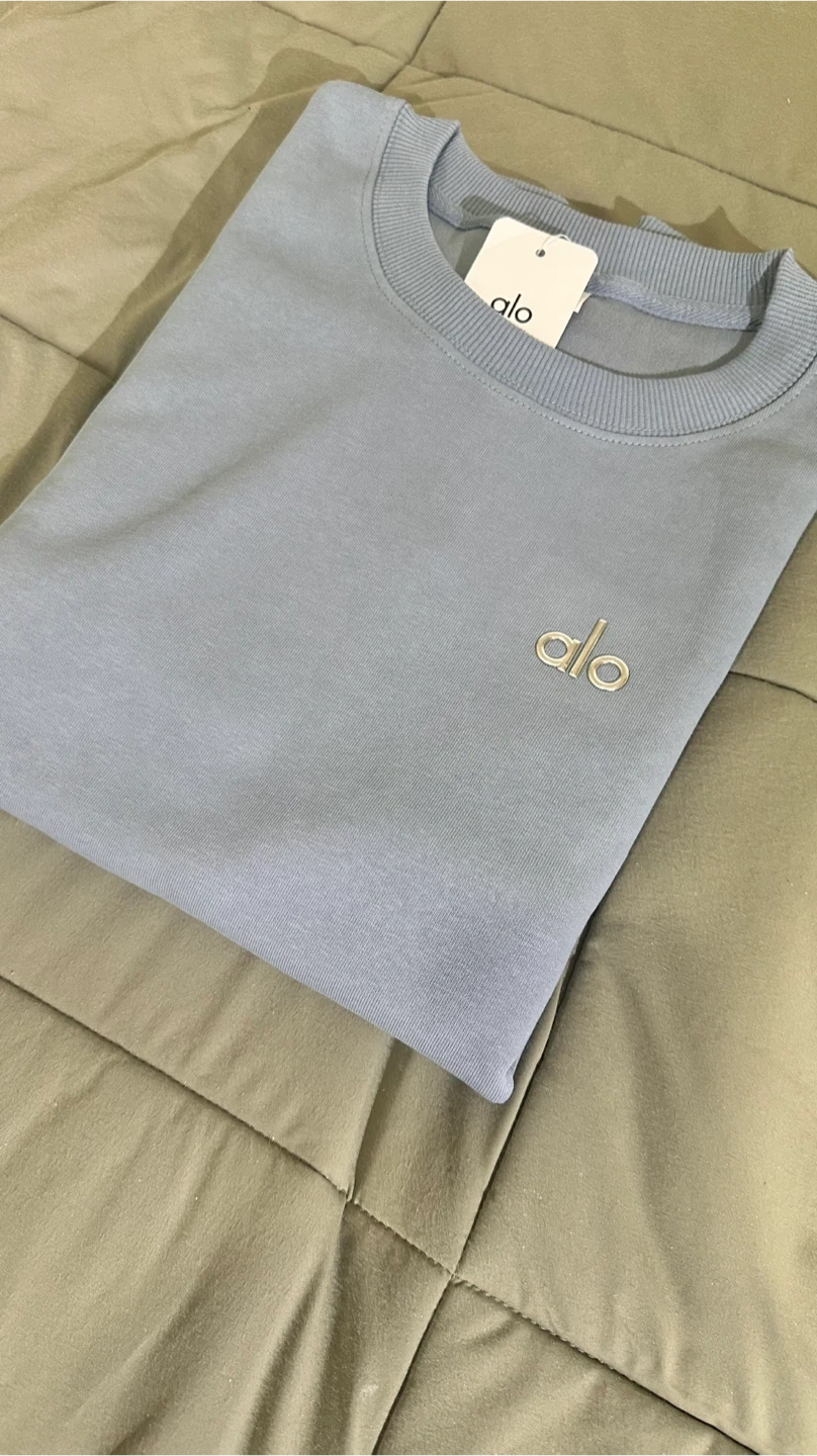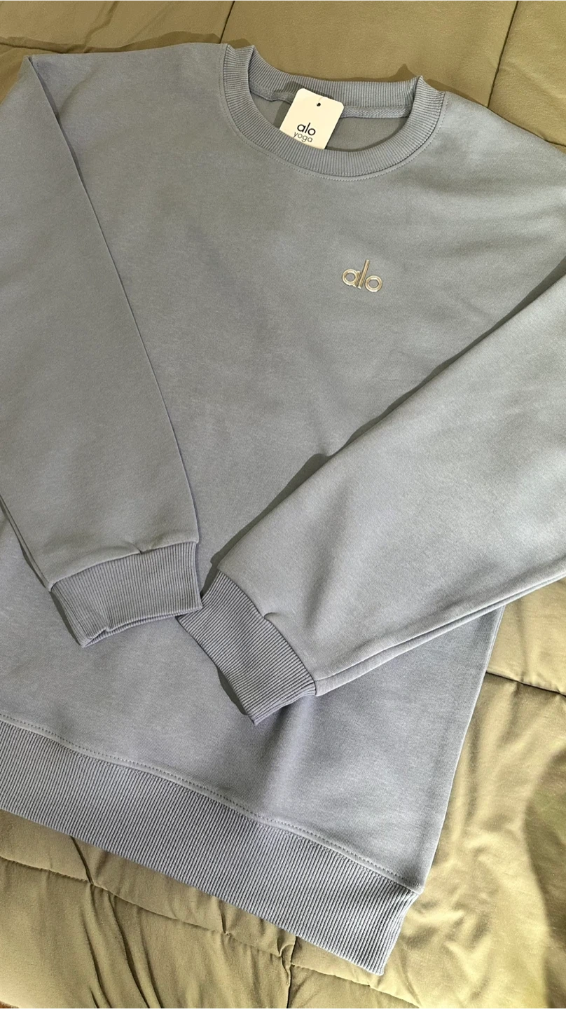 This is an ALO Yoga crew neck sweatshirt in a lovely blue colour! It's in great condition and would be a comfy addition to your wardrobe. Perfect for yoga or just lounging around the house!