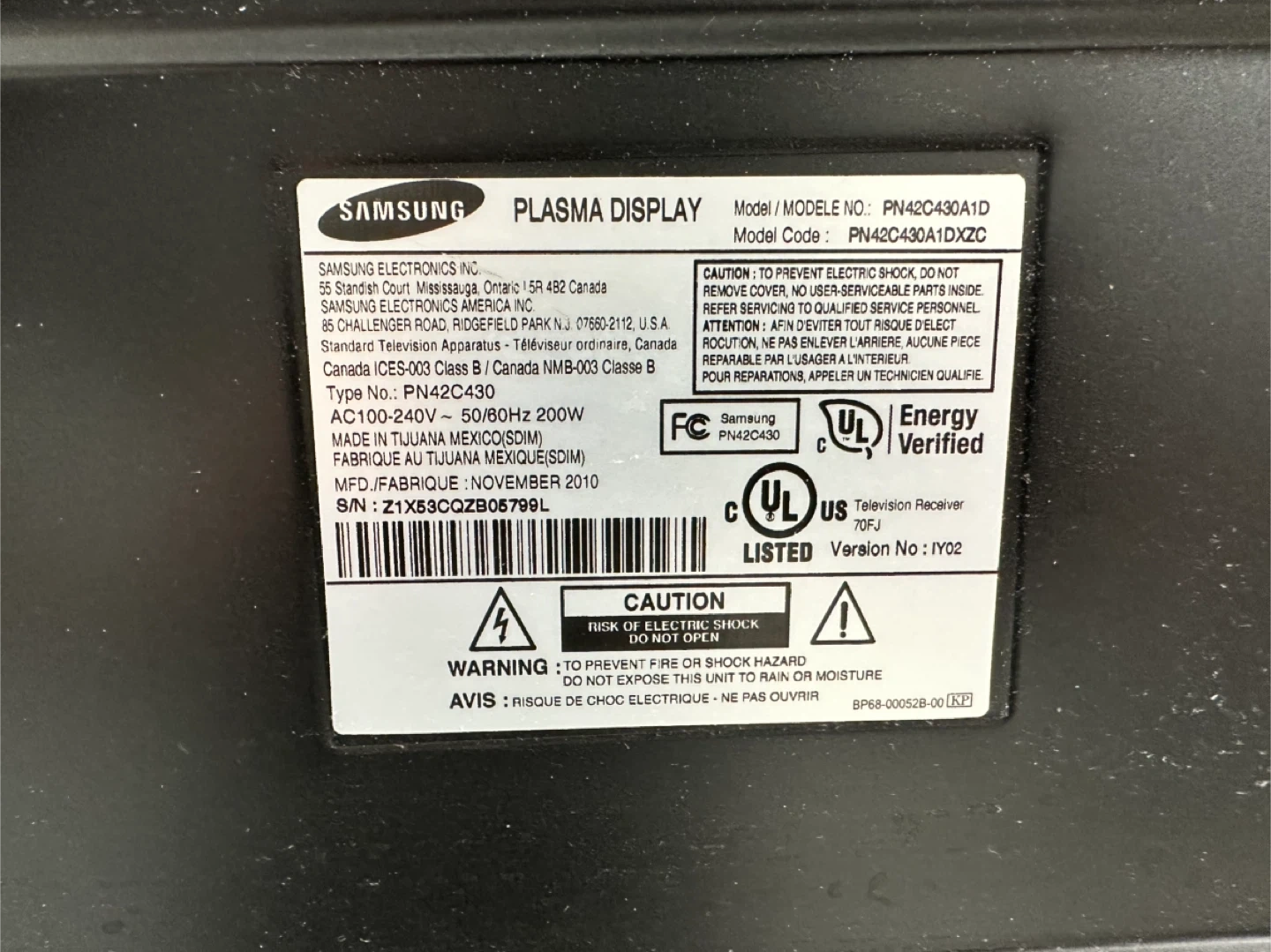 Selling a Samsung 42-inch plasma TV, model number PN42C430A1D. It's in good working condition. The manufacturing date is November 2010.