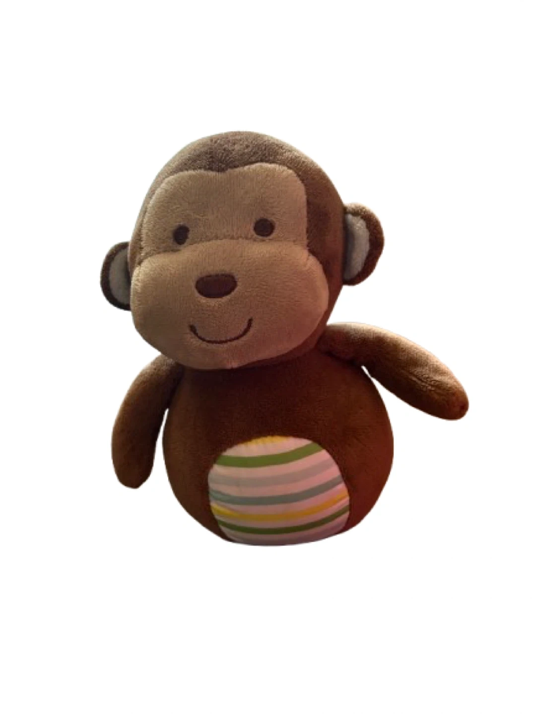Adorable Carter’s monkey plush featuring soft brown fabric, a light tan face and belly, and a cute striped pastel tummy panel. This plush has a friendly embroidered expression, short rounded limbs, and a long tail, making it perfect for nursery décor, playrooms, or collectors of Carter’s stuffed animals. Made with polyester fibers and surface‑washable for easy care.
