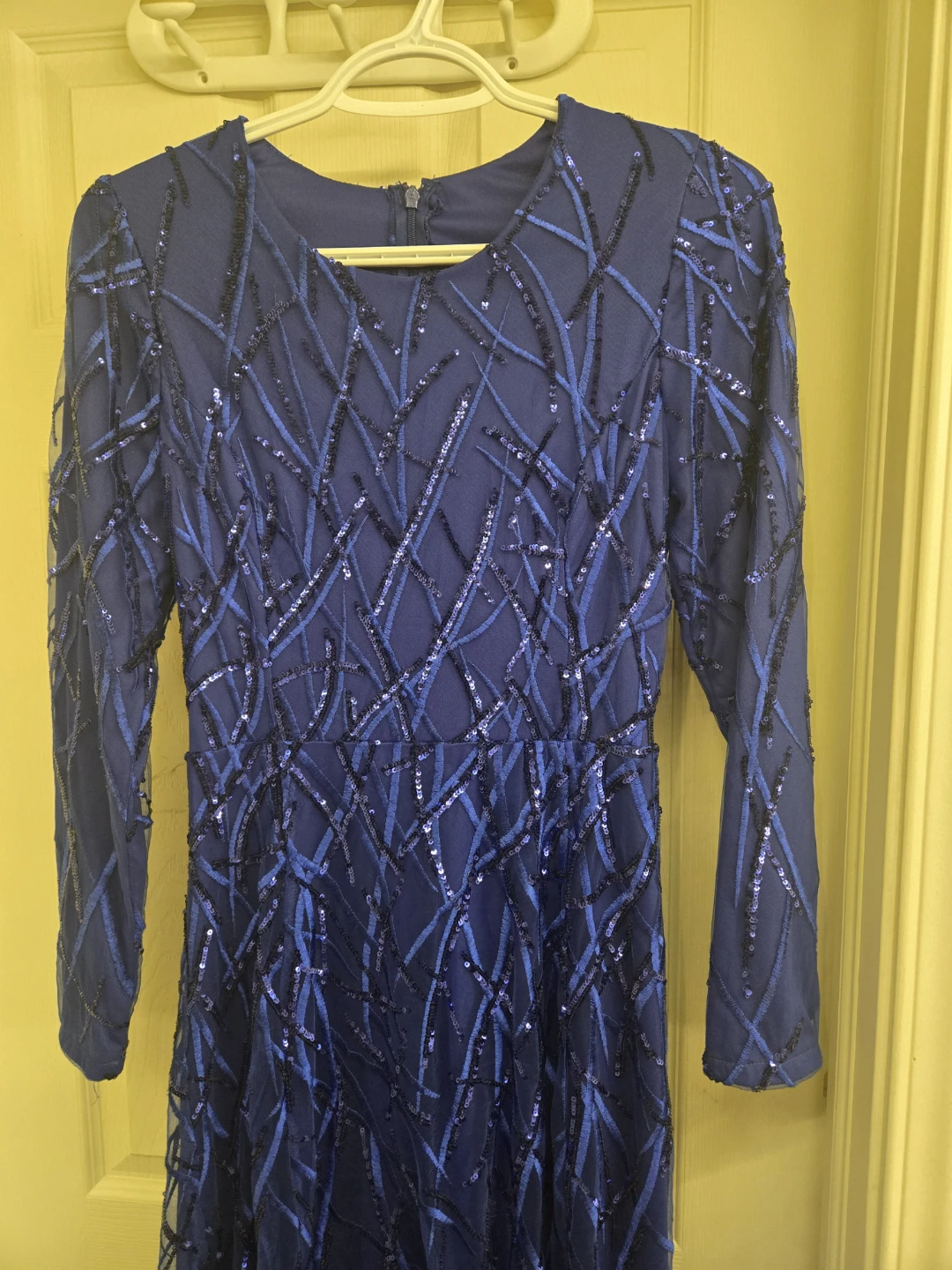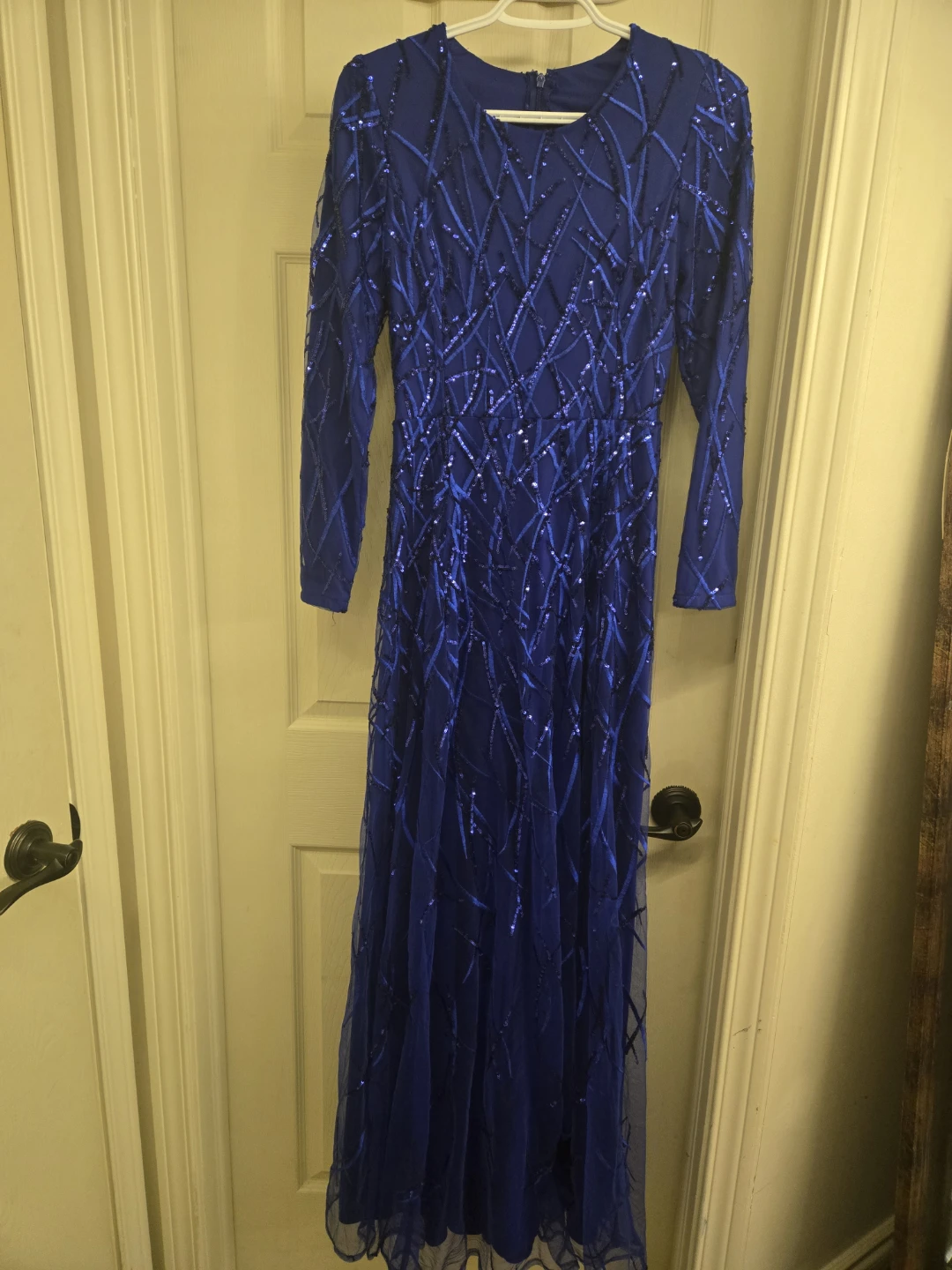 This stunning royal blue maxi dress is fully embellished with shimmering sequins and beadwork. It features long sleeves and a flowing tulle overlay. Perfect for a special occasion or formal event!