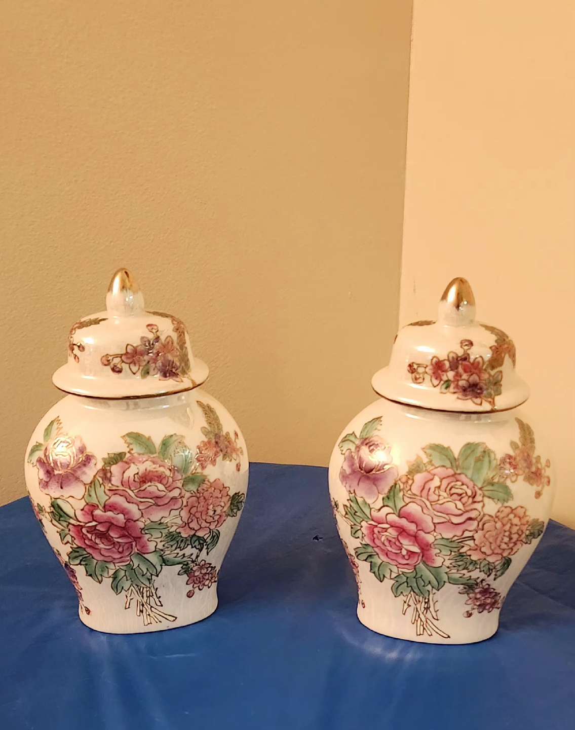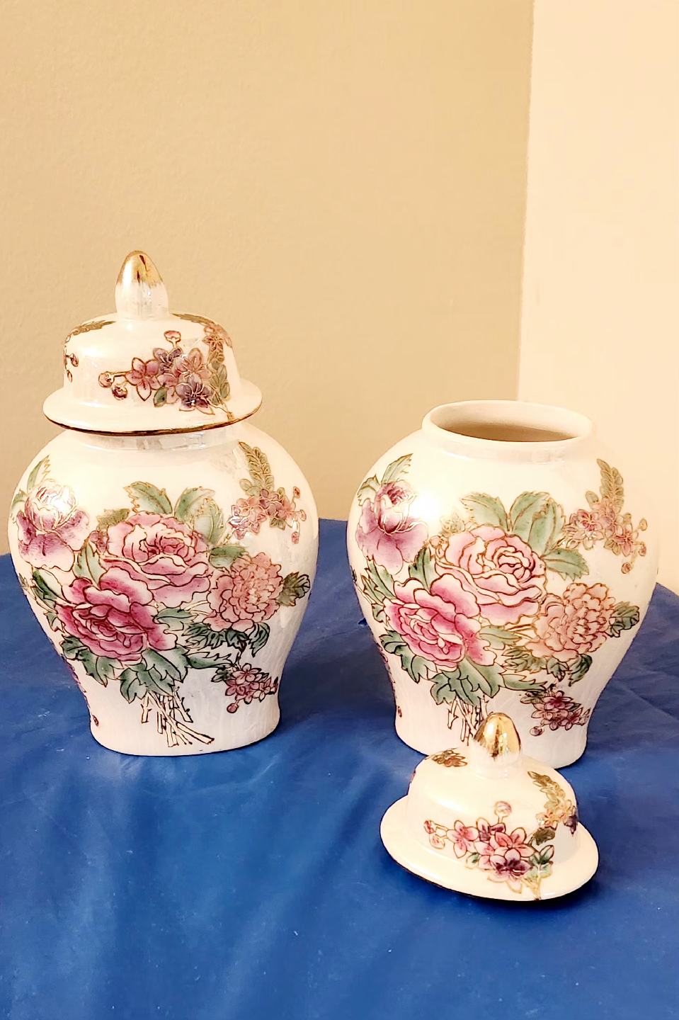 Selling a pair of lovely floral ceramic vases, each with a matching lid. They feature a delicate floral design with pink and green accents on a white background. Perfect for adding a touch of elegance to any room