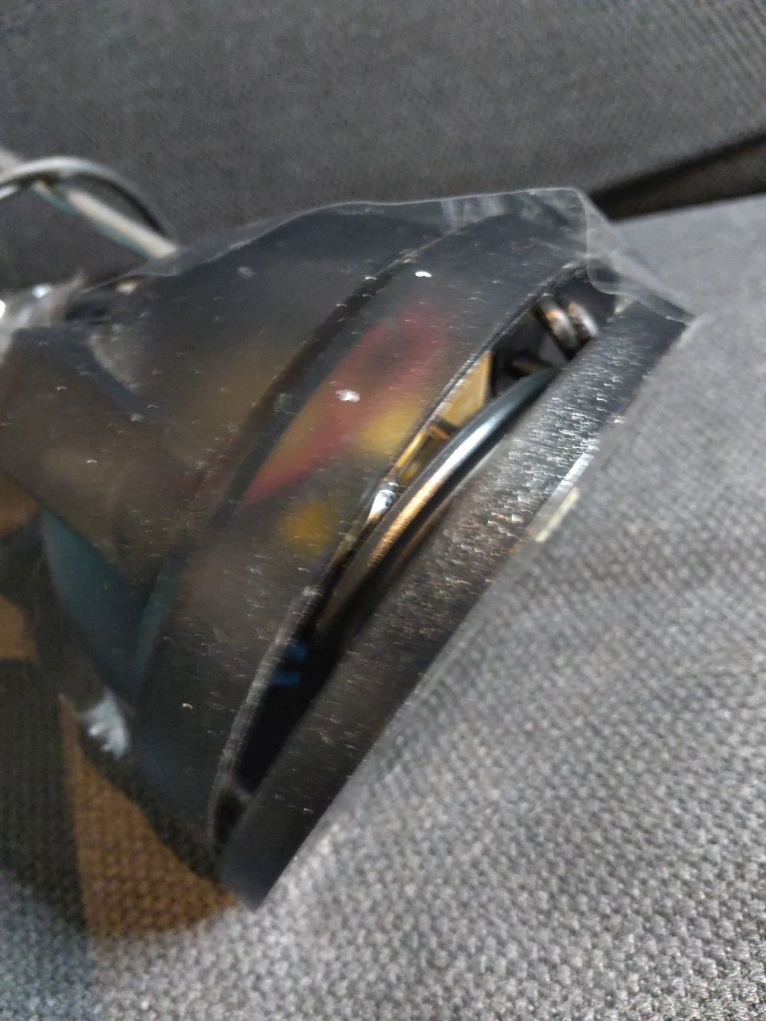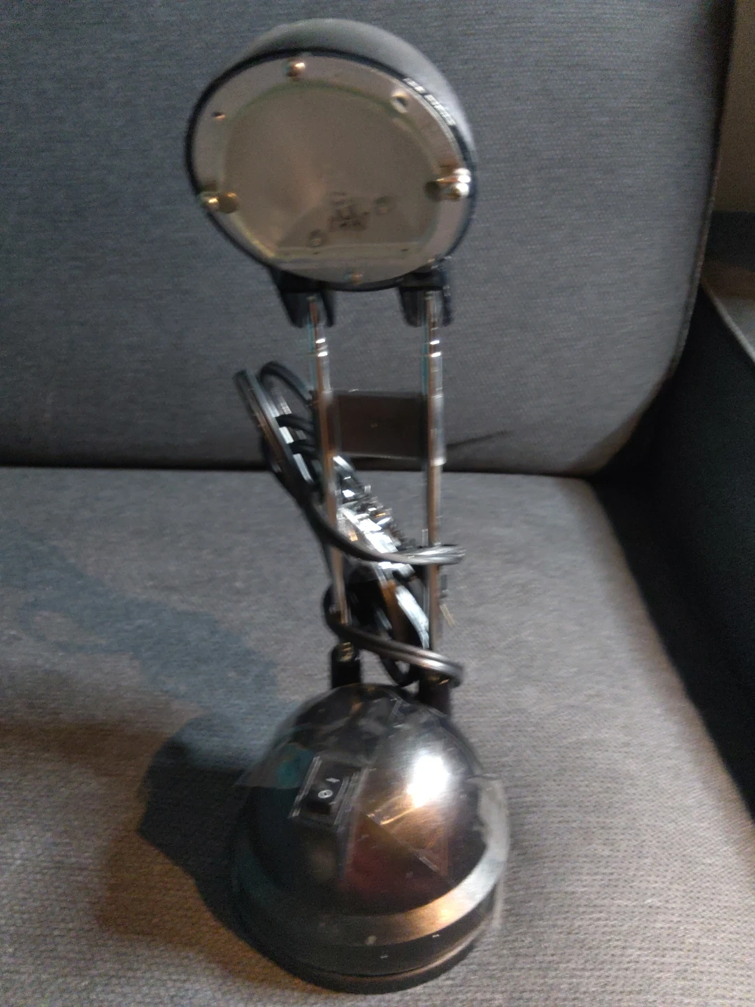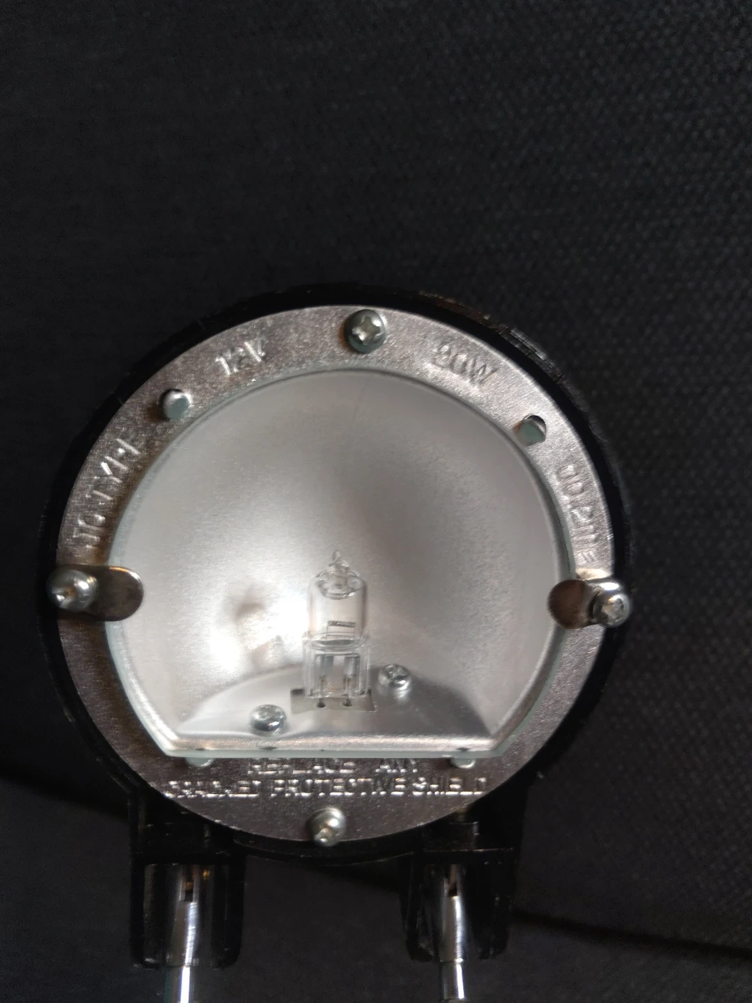 This is a black adjustable desk lamp. It uses a 90W bulb and operates at 12V. The lamp has a flexible neck for easy positioning. Great for task lighting!
