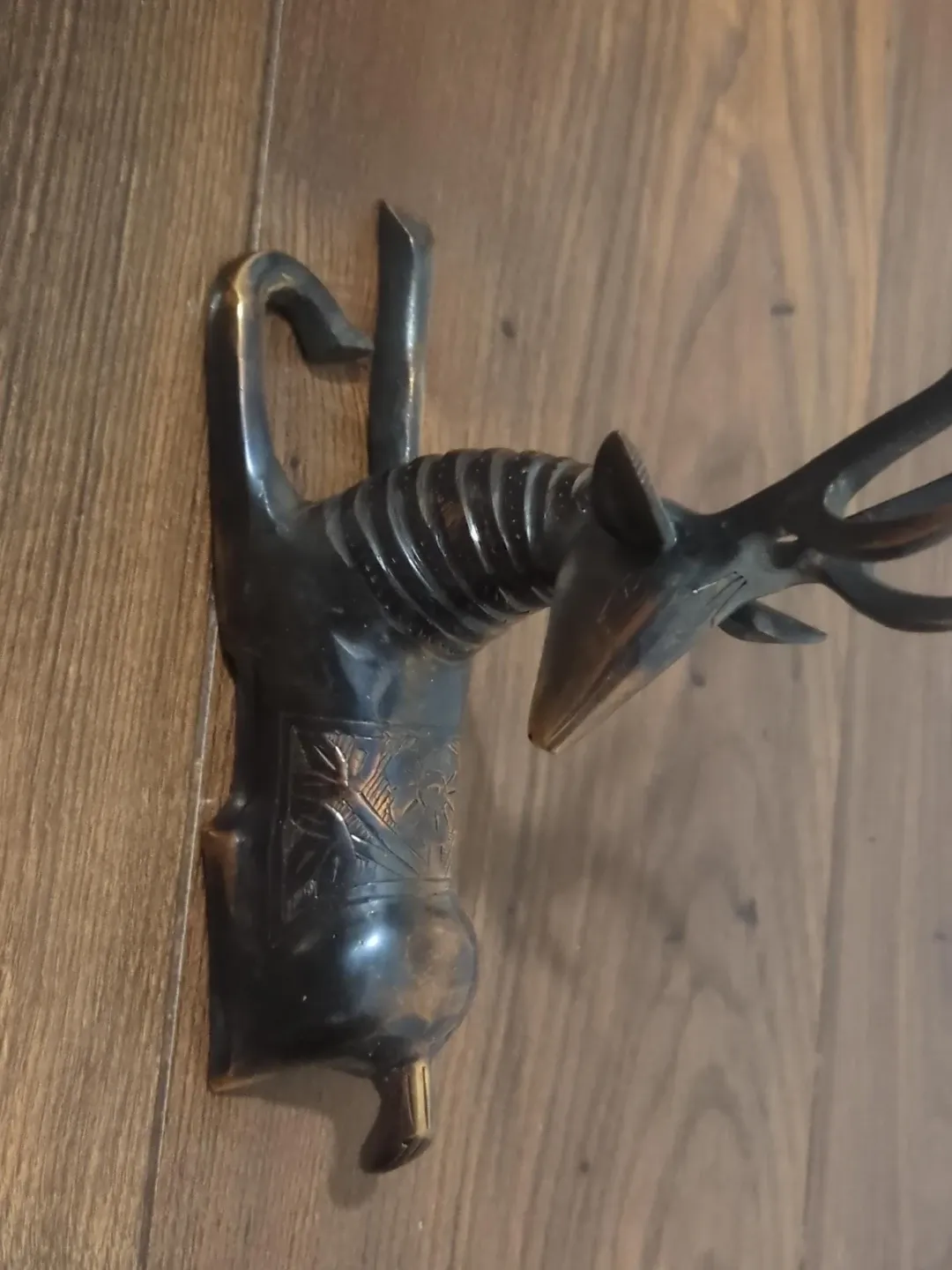 This is a decor piece It's made of metal with a bronze-like finish and is heavier than ut looks. The body has an etched pattern, and the antlers are prominent. It's a unique piece!