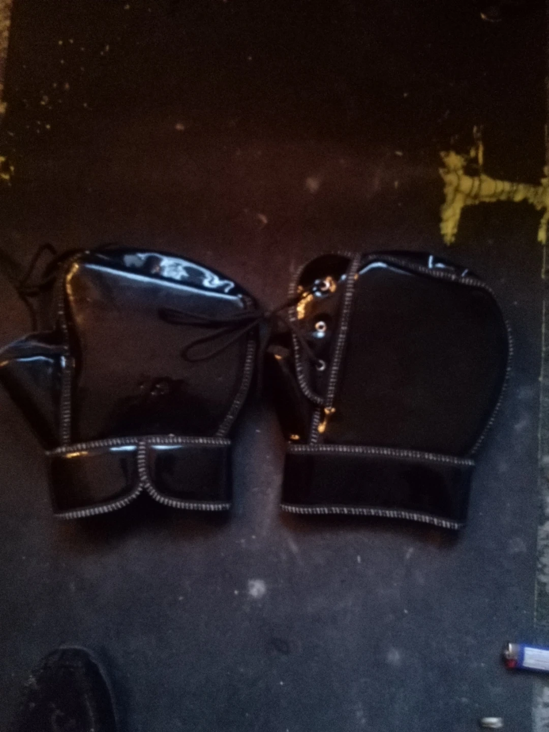 Pair of black shiny winter riding gloves. They feature lace-up closure and decorative stitching. Material appears to be faux leather.