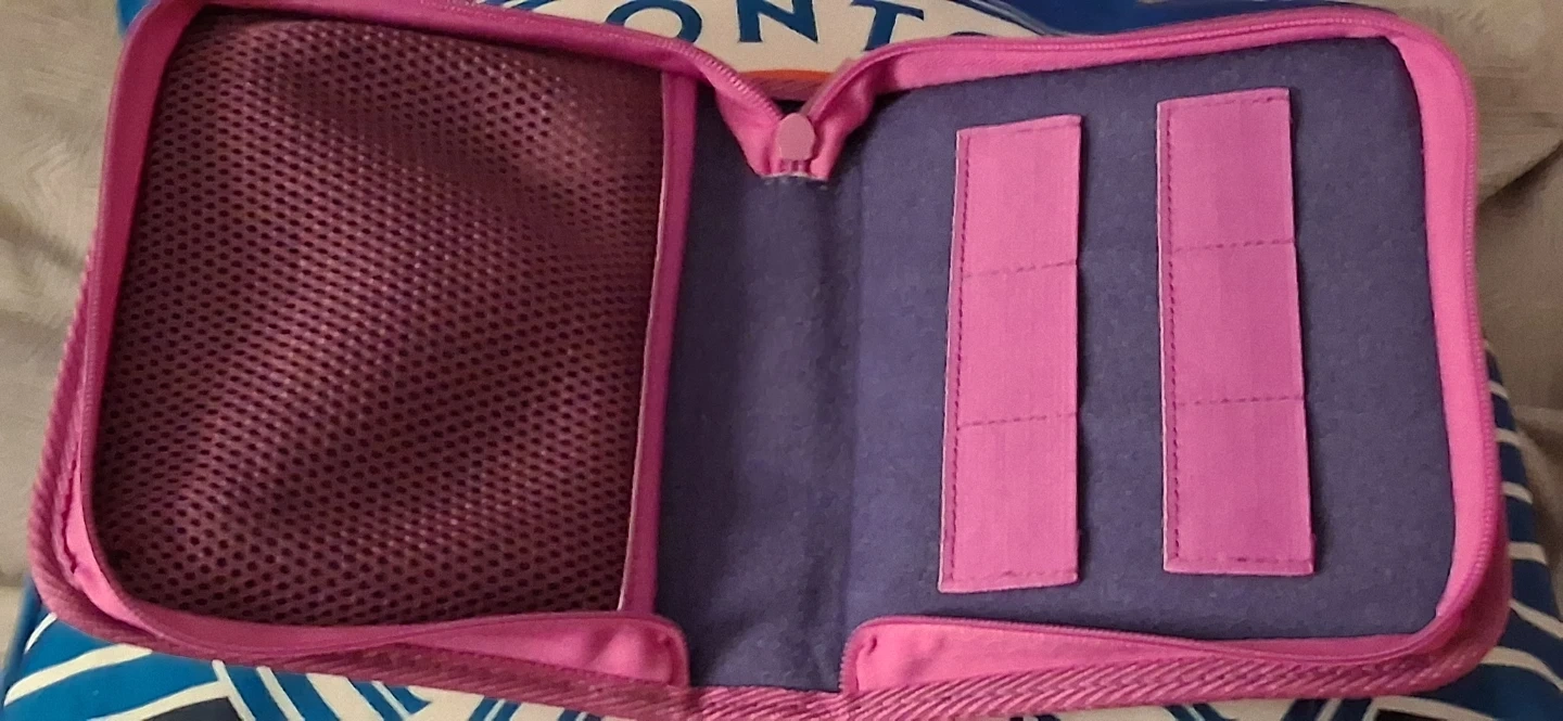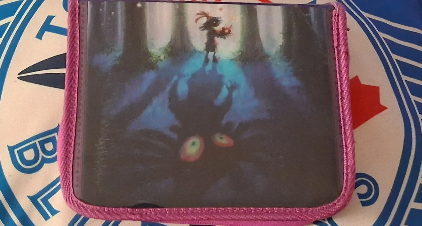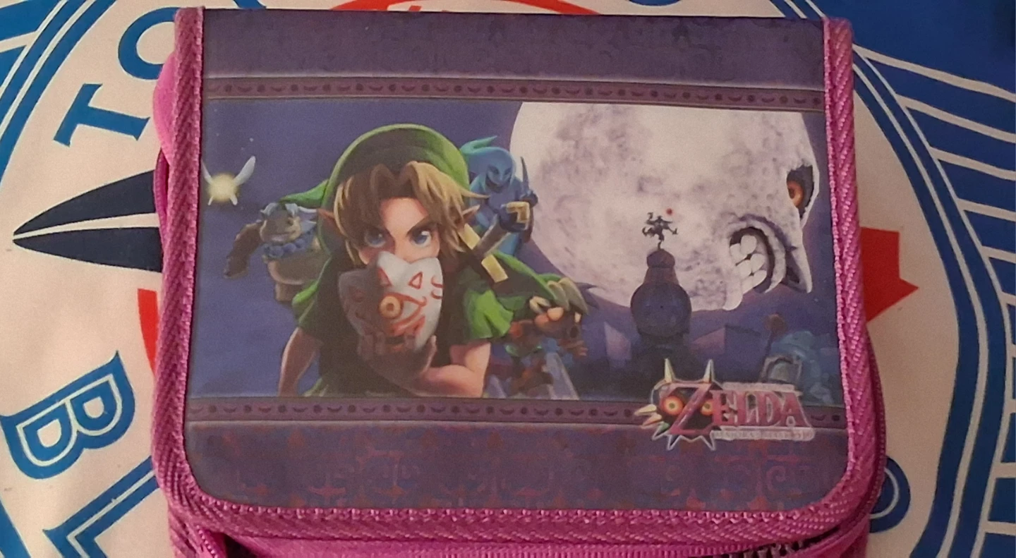 This Zelda 3ds case features Link with Majora's Mask on the front. It has a zippered closure and an interior mesh pocket with elastic straps. Perfect for for storing your 3ds and games.