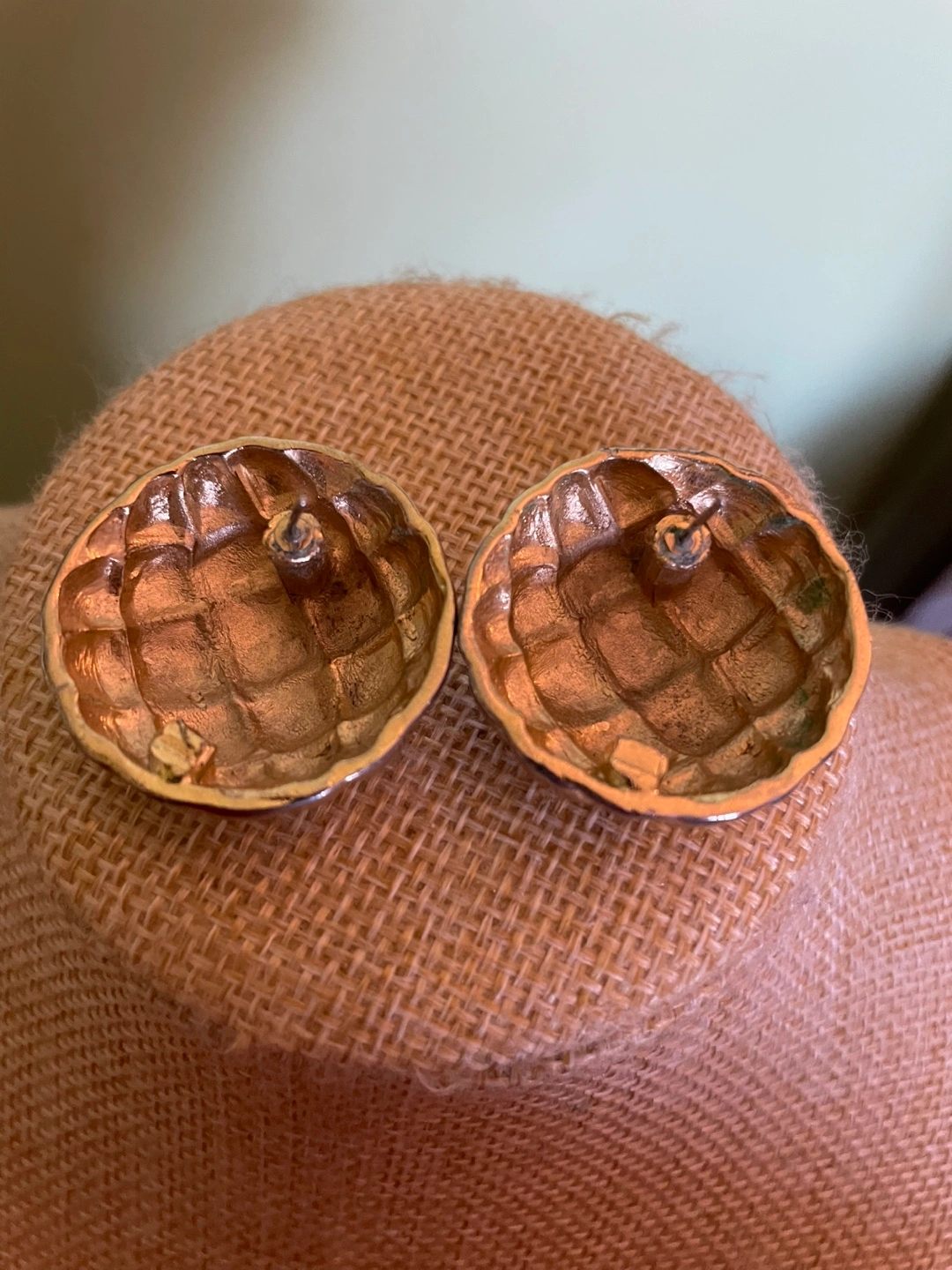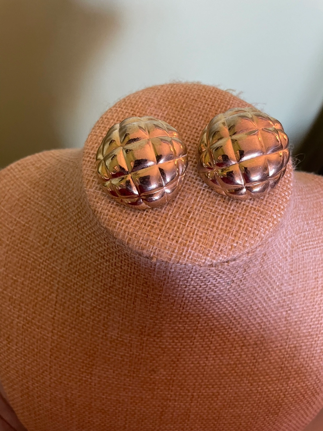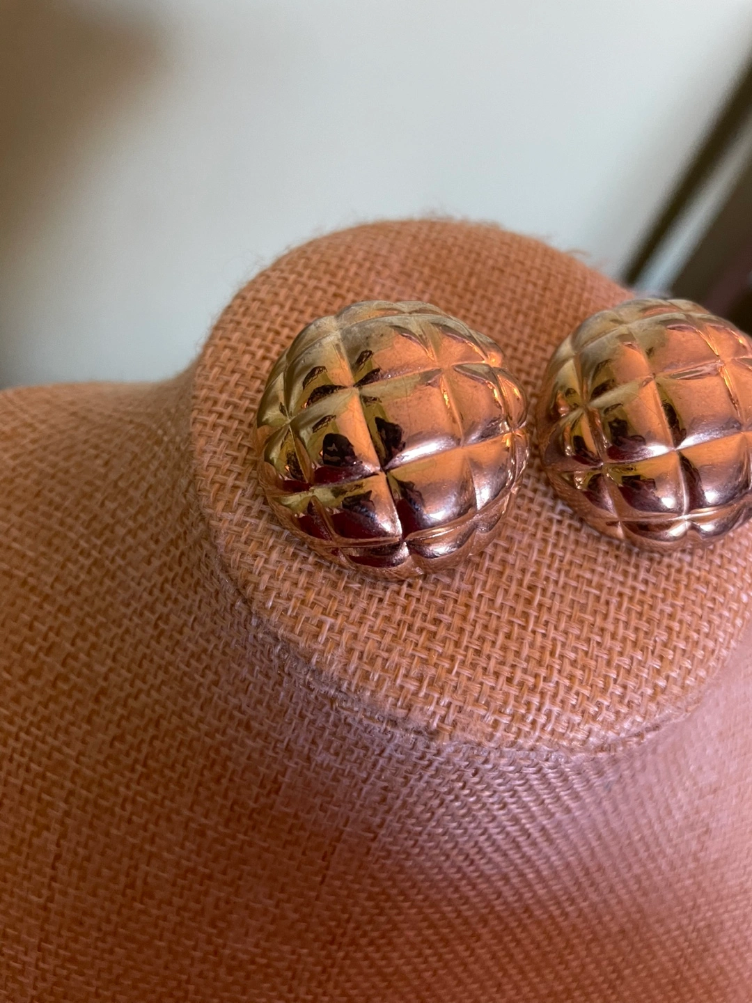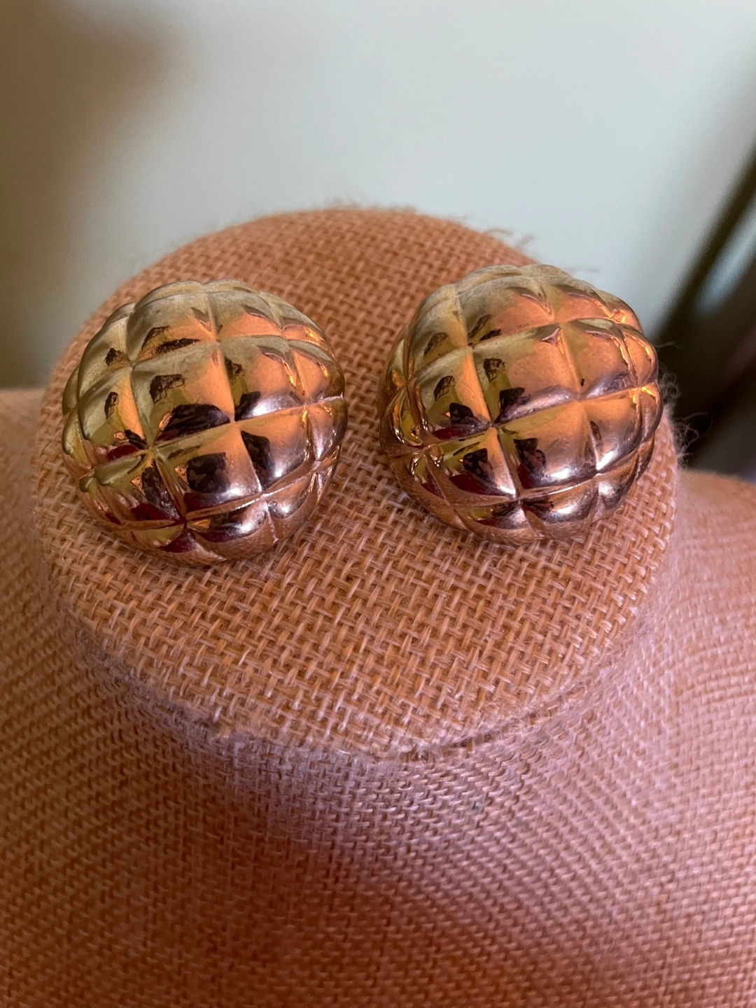 Pair of vintage gold tone clip on earrings. Round, puffy design. Excellent condition.