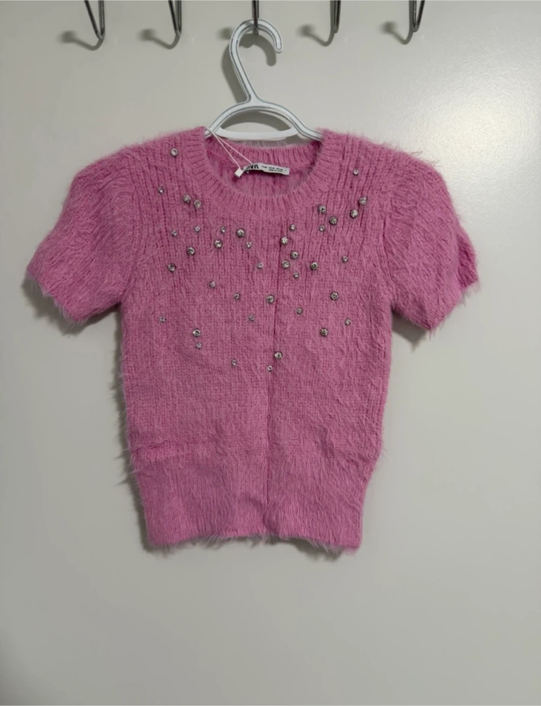 Brand new ZARA fuzzy short-sleeve sweater in a vibrant pink hue. It's adorned with sparkling rhinestones across the front. Size is medium.