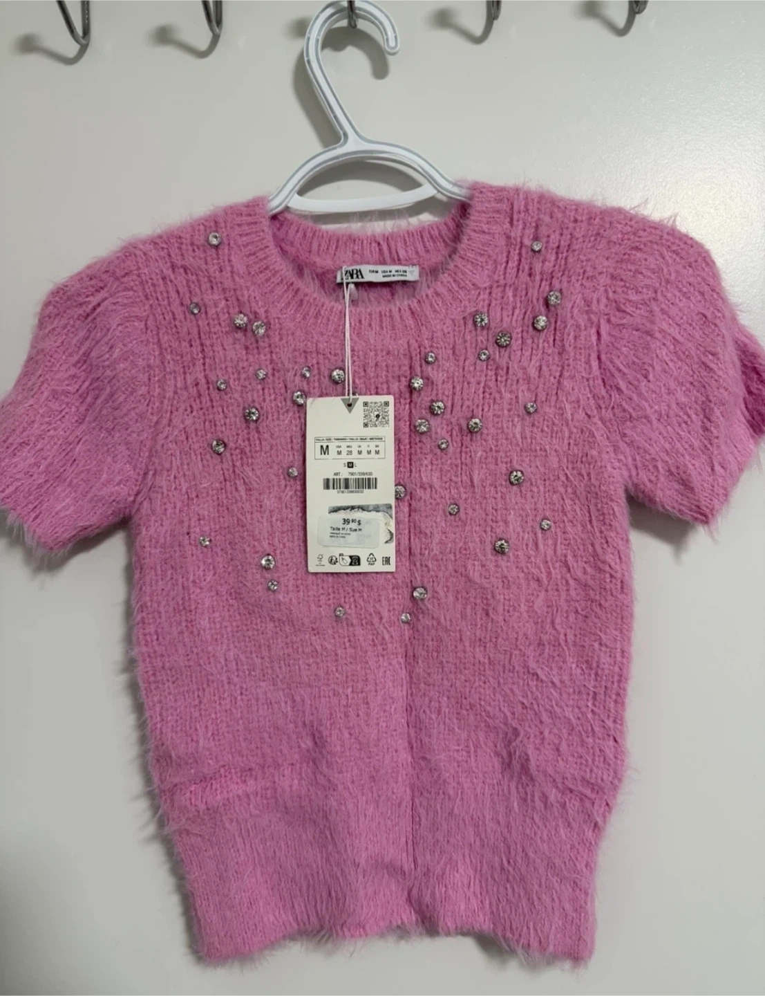 NWT -ZARA Pink Rhinestone Fuzzy Short Sleeve Sweater - Size M