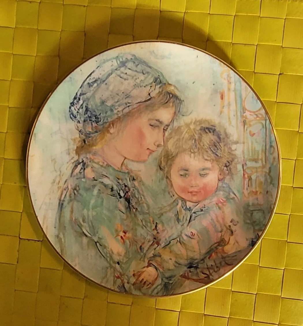 Dalton. This is a decorative collector's plate featuring a heartwarming artwork of a mother and child. The artwork has a soft, impressionistic style with a gold-tone rim. It's a lovely piece for display!