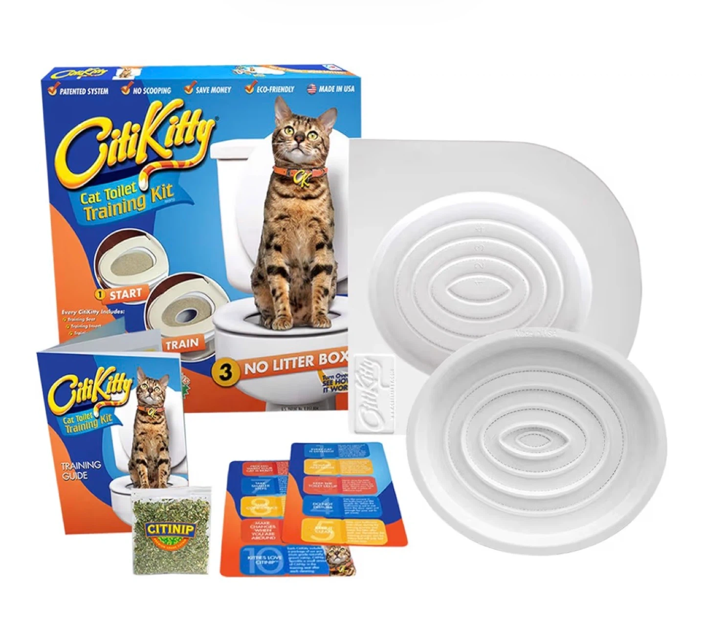 This is the CitiKitty Cat Toilet Training Kit. It's designed to help cats transition from a litter box to a toilet. The kit includes training rings and a guide. It's a patented system made in the USA, as shown on Shark Tank.
