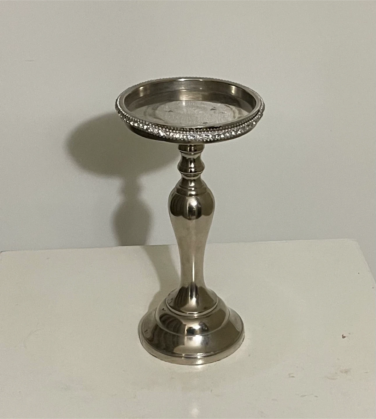 A shiny silver candlestick holder with a decorative rim of rhinestones. It's designed with a classic pedestal base for stability. This holder would look lovely on a mantle or side table in any room in the house. Excellent condition, like new . From smoke-free, pest-free, and pet-free home.